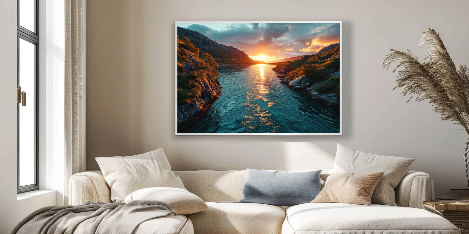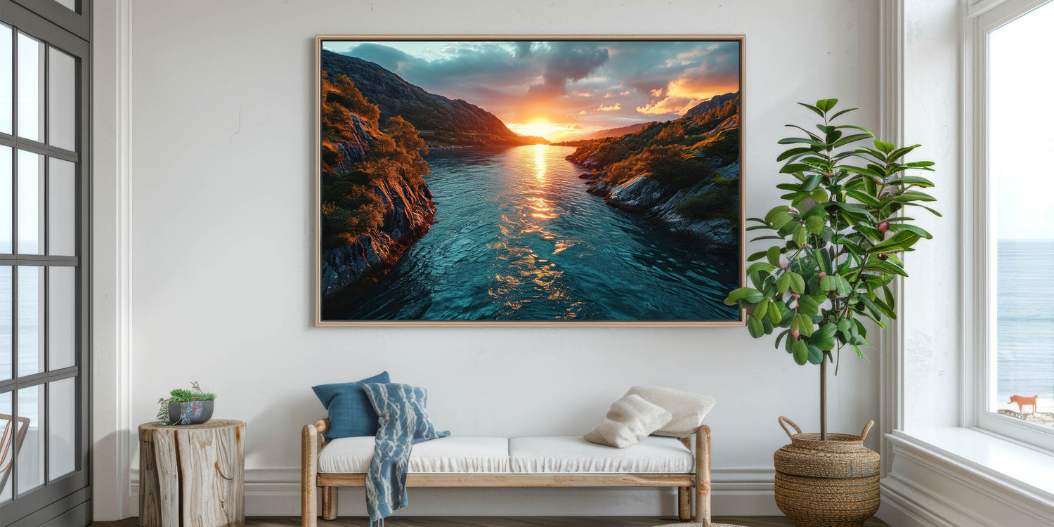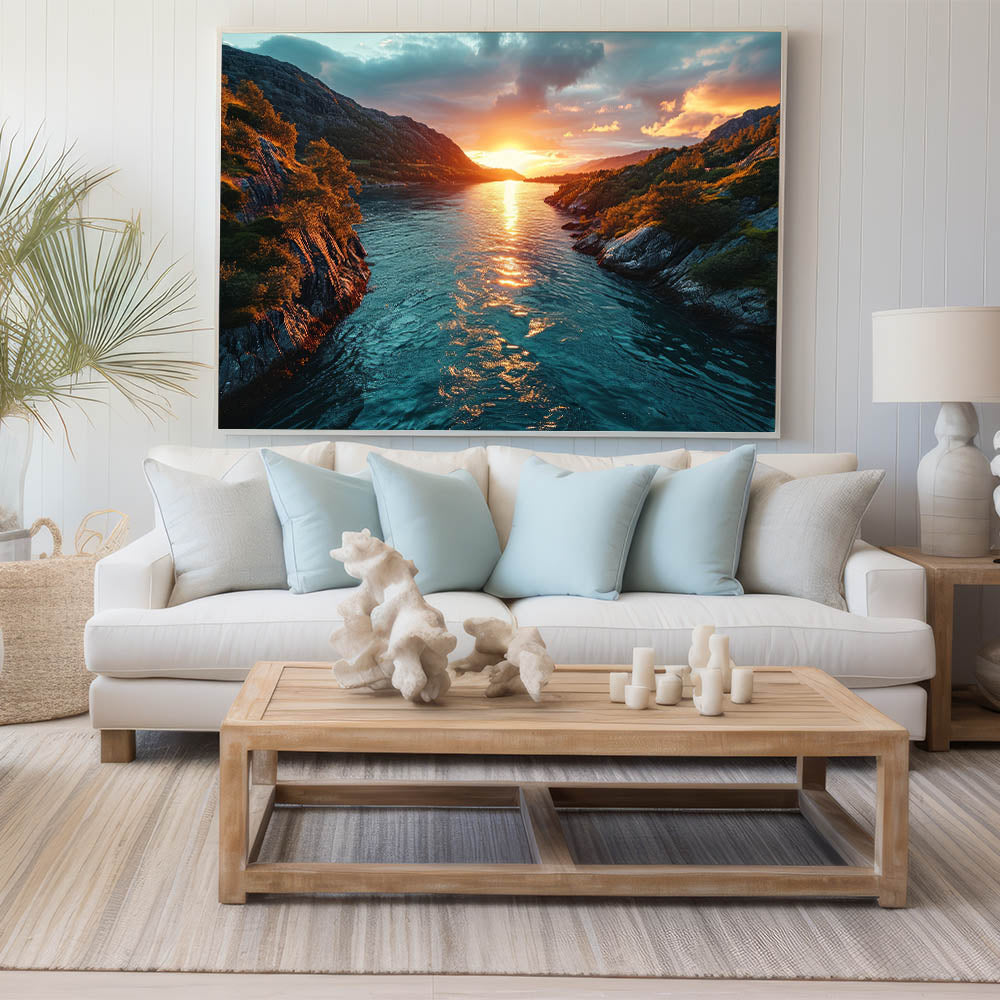 Sunset River Valley Wall Art – Vibrant Coastal Landscape Nature Print