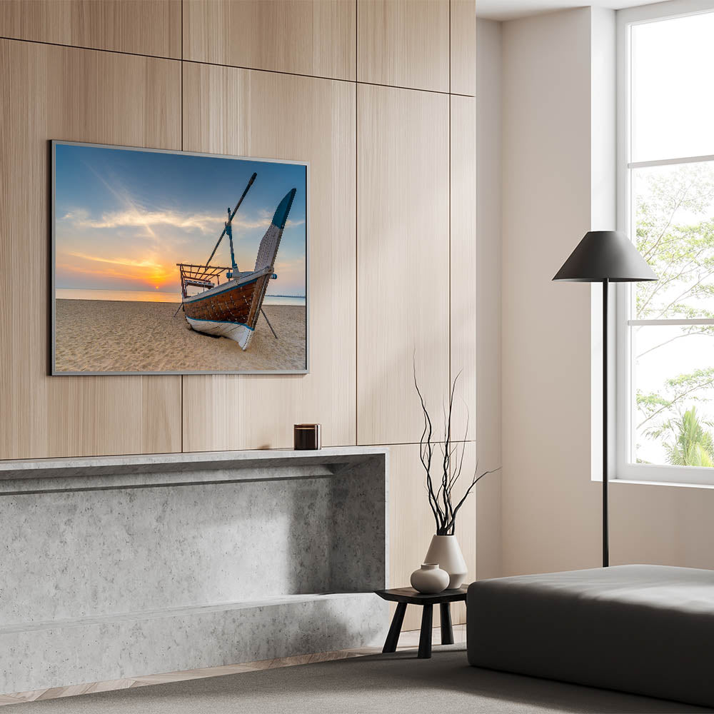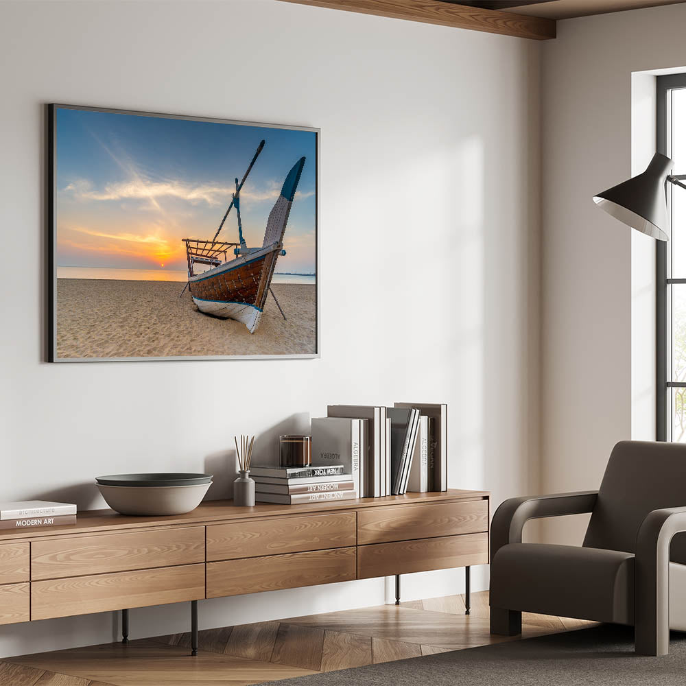 Embrace the calm and beauty of the Arabian Gulf with our "Sunset Serenity in Doha - Traditional Boat Canvas Print." This captivating artwork depicts a traditional Qatari boat, known as a dhow, resting peacefully on the shore as the sun sets in the background, painting the sky in warm hues.