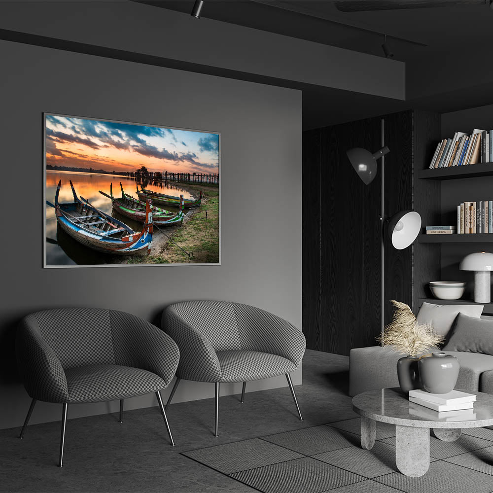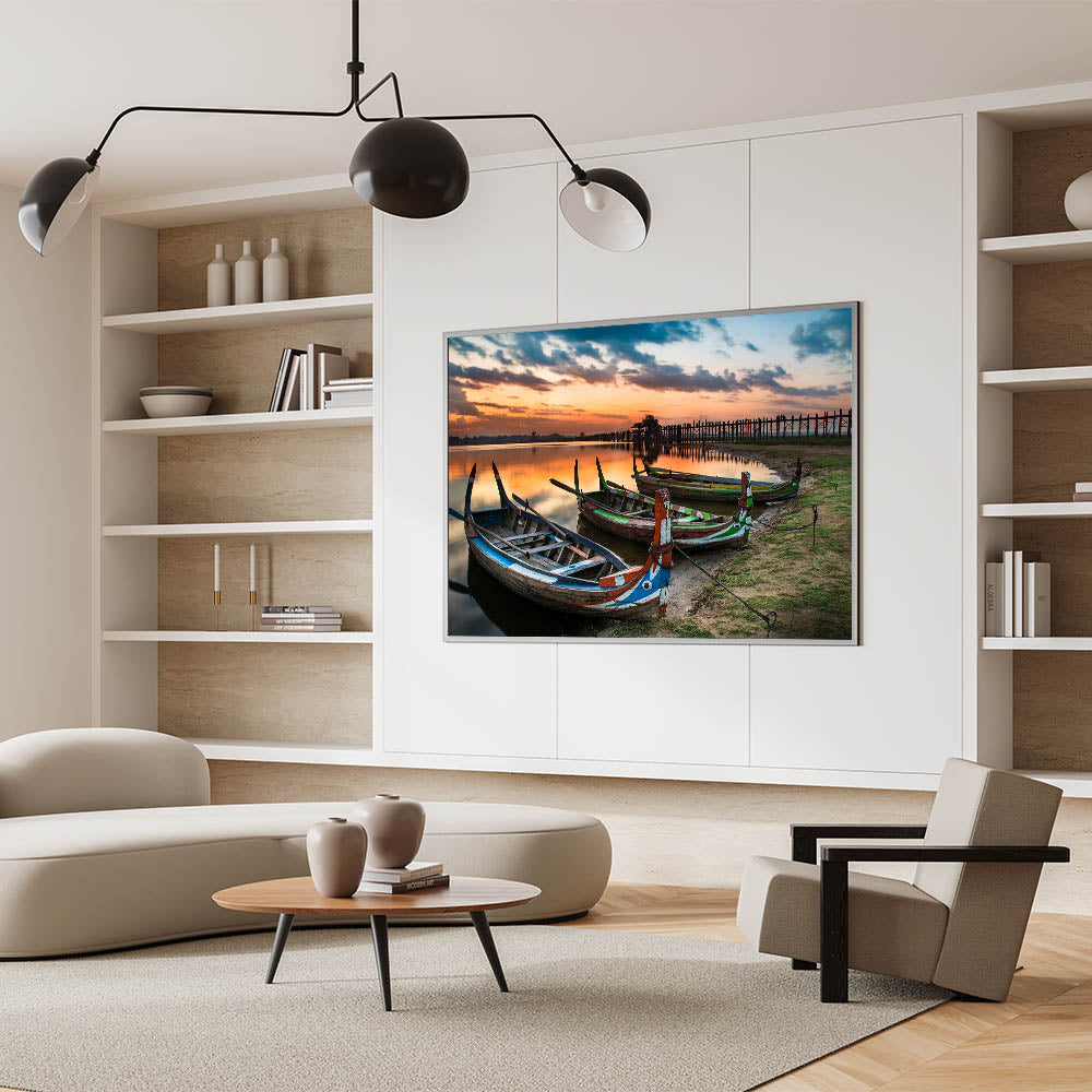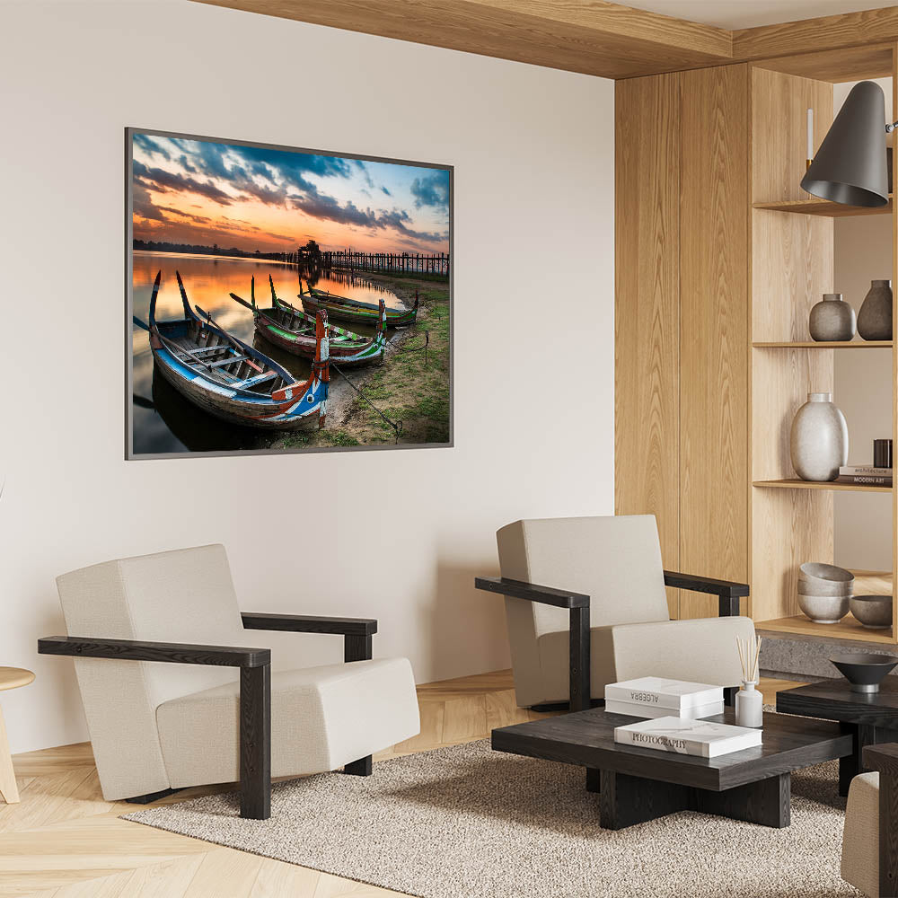 Bring the serene beauty of Myanmar into your home with this stunning wall art featuring traditional boats resting along the shore at the iconic U Bein Bridge during sunset. This breathtaking image captures the peaceful ambiance of Myanmar's rich landscapes, offering a unique glimpse into Southeast Asian culture.