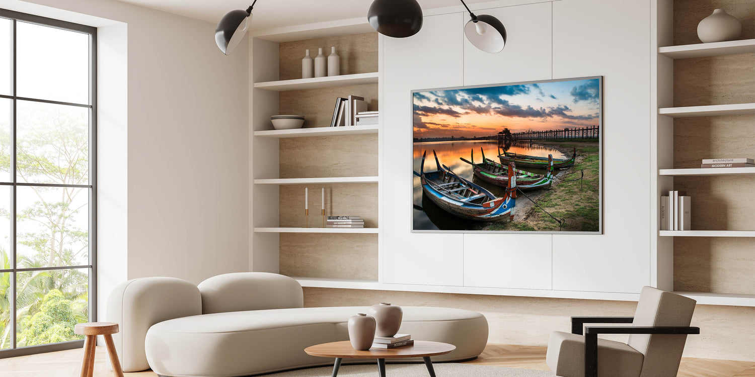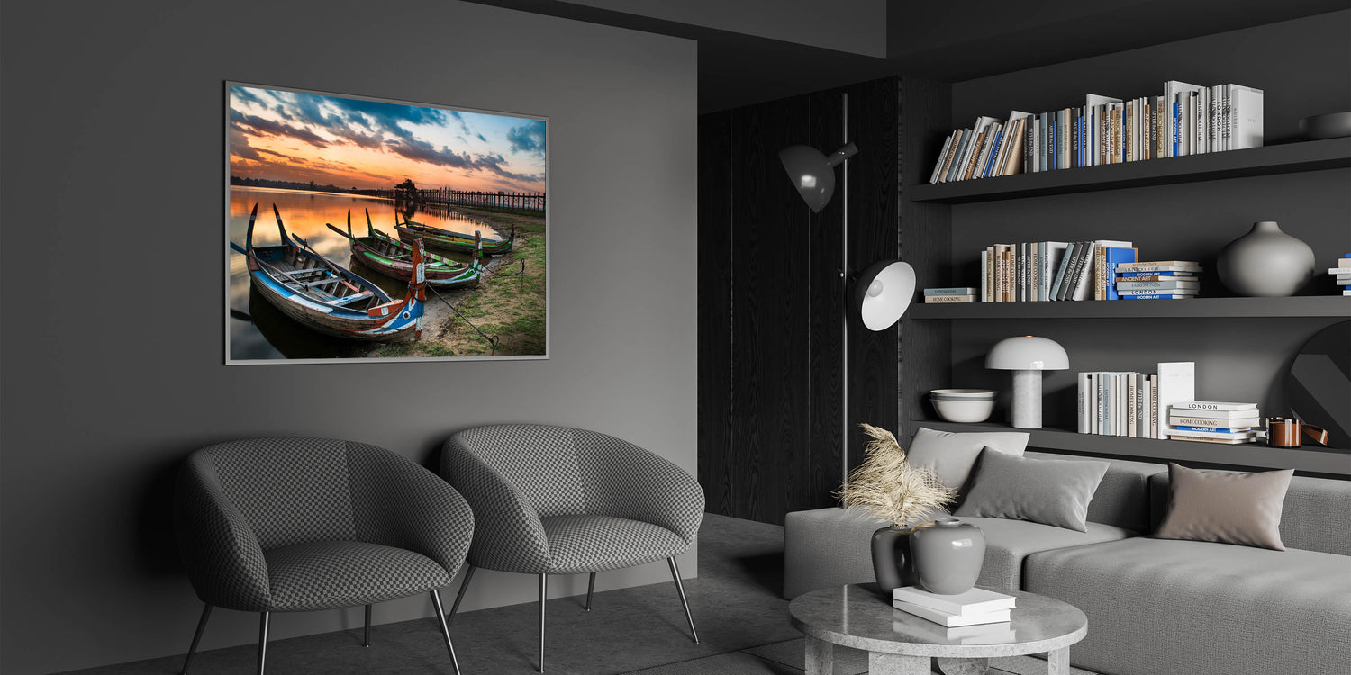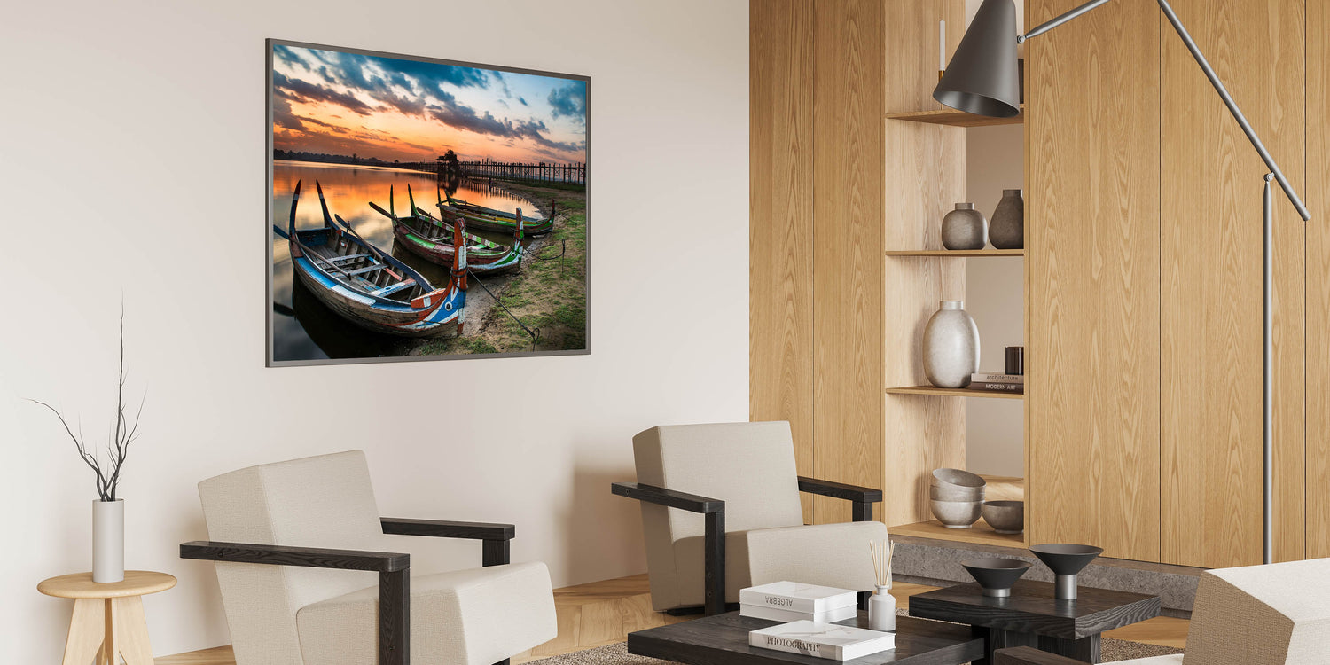 Bring the serene beauty of Myanmar into your home with this stunning wall art featuring traditional boats resting along the shore at the iconic U Bein Bridge during sunset. This breathtaking image captures the peaceful ambiance of Myanmar's rich landscapes, offering a unique glimpse into Southeast Asian culture.