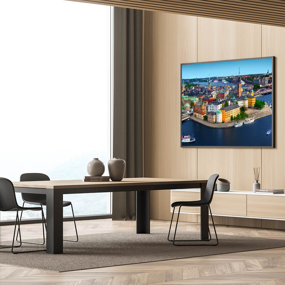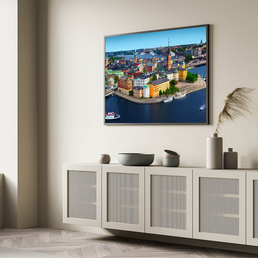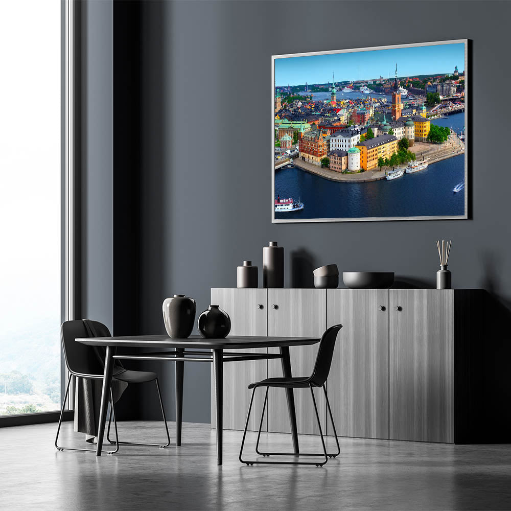 Capture the dynamic beauty of Sweden’s capital with this stunning framed art featuring the vibrant Stockholm cityscape. With its colorful buildings, bustling waterfront, and iconic architecture, this artwork perfectly illustrates the urban charm of one of Scandinavia’s most picturesque cities. The detailed view of Stockholm, combined with its lively colors, brings a modern and energetic atmosphere to any space.