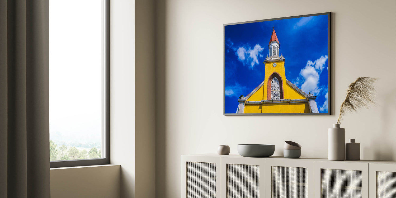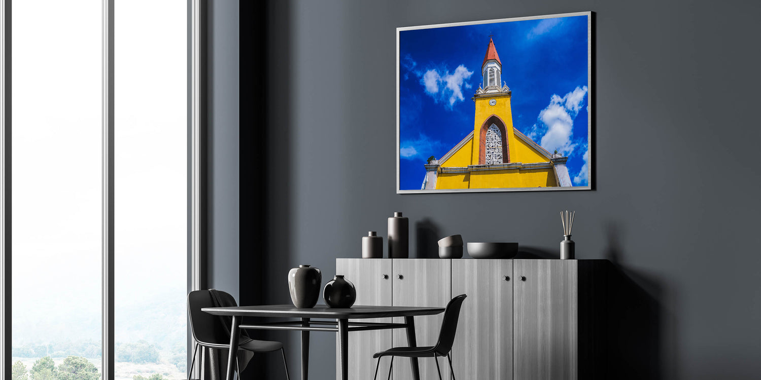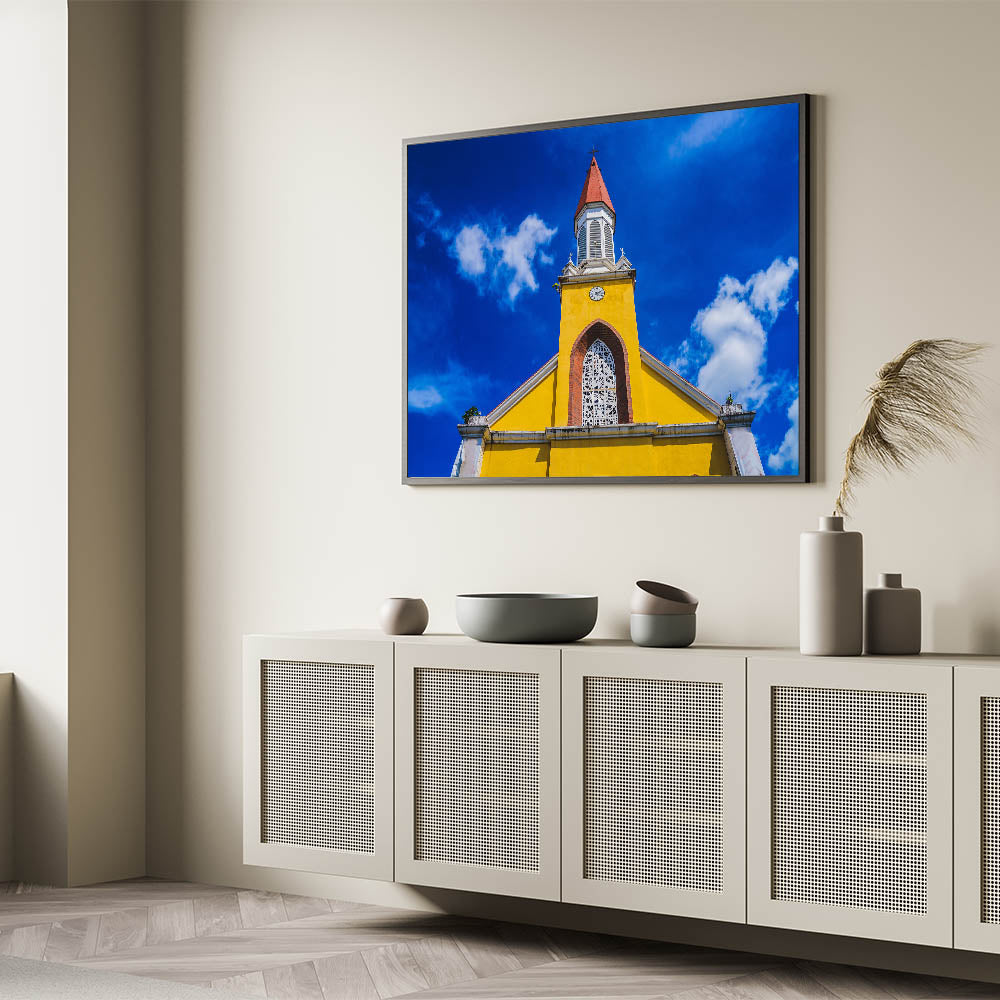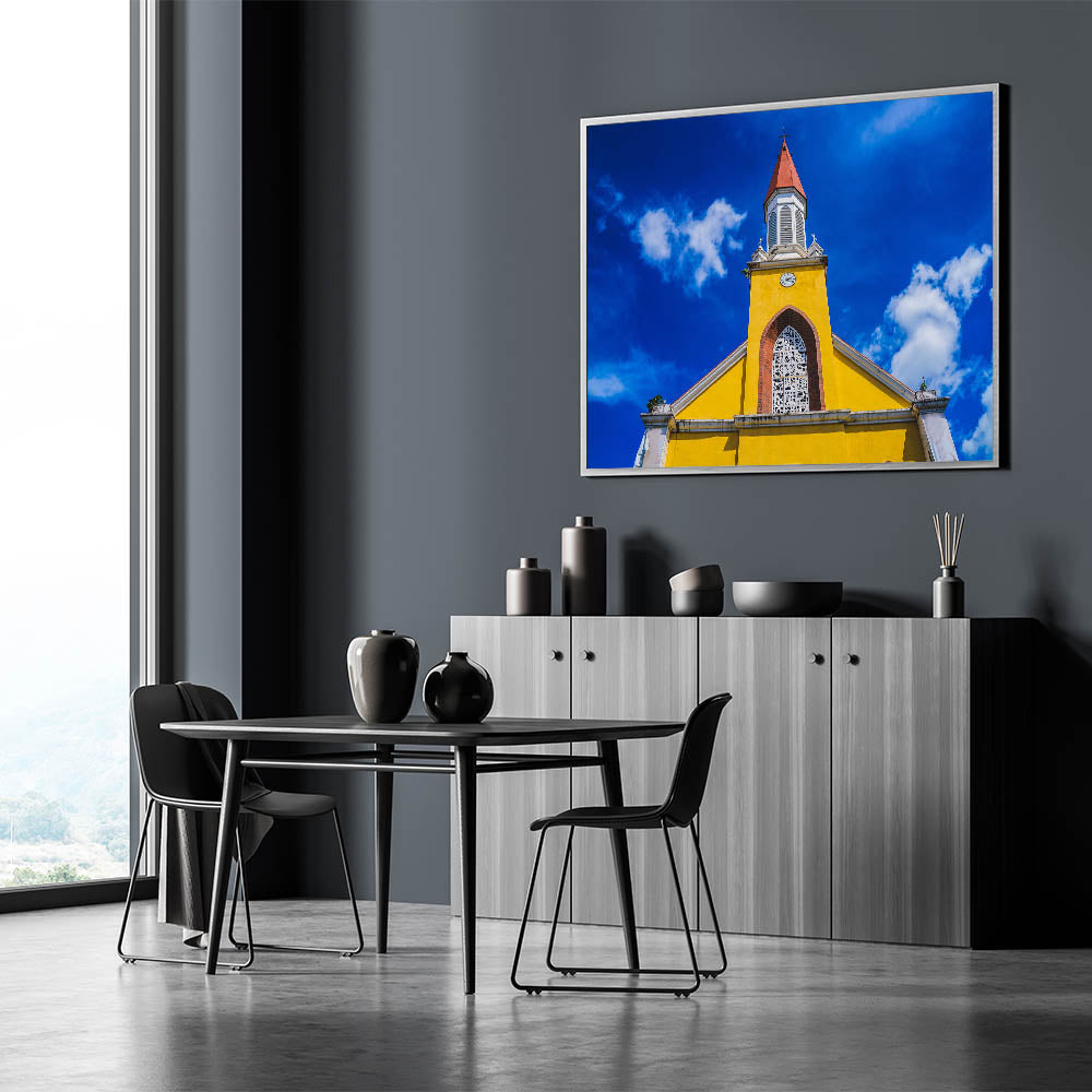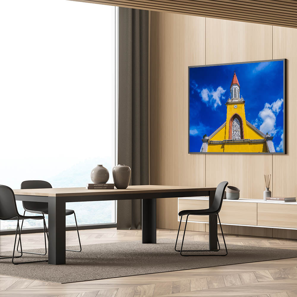 - Vibrant Display: Features a striking yellow church set against a deep blue sky.