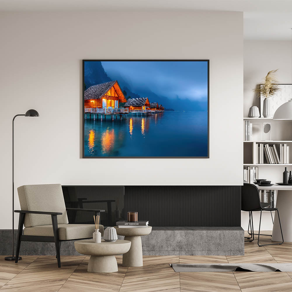 Introducing our "Tahiti Island Photography - Tropical Wall Decor" canvas, featuring a row of vibrant, multicolored waterfront cottages. This unique piece captures the essence of French Polynesia's charming island lifestyle with its bright and cheerful architecture set against the backdrop of a serene tropical beach.