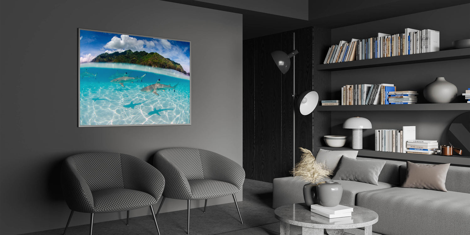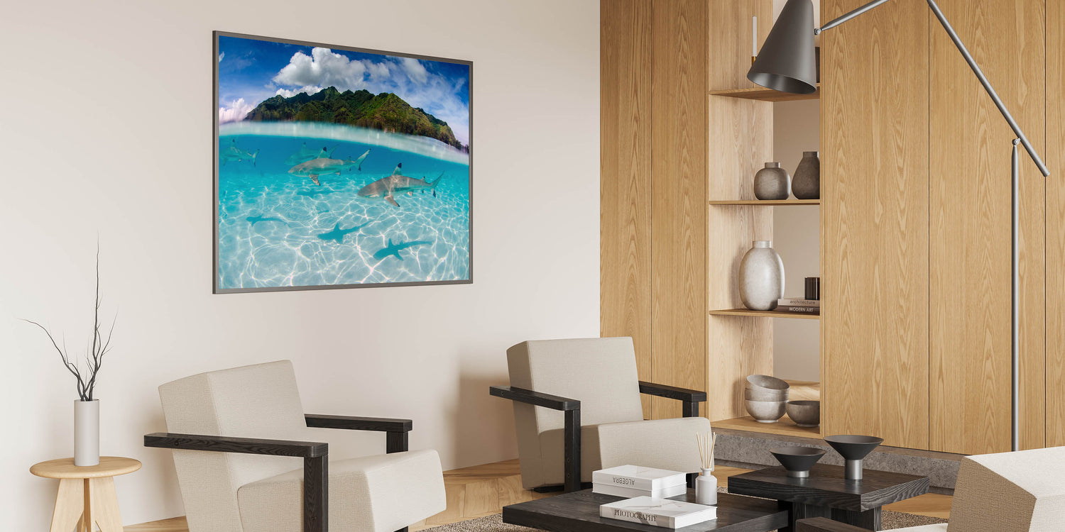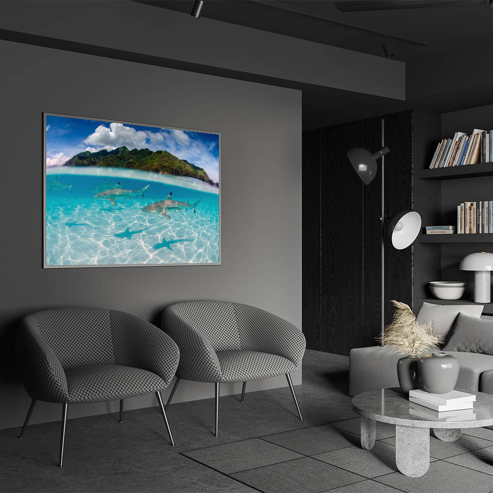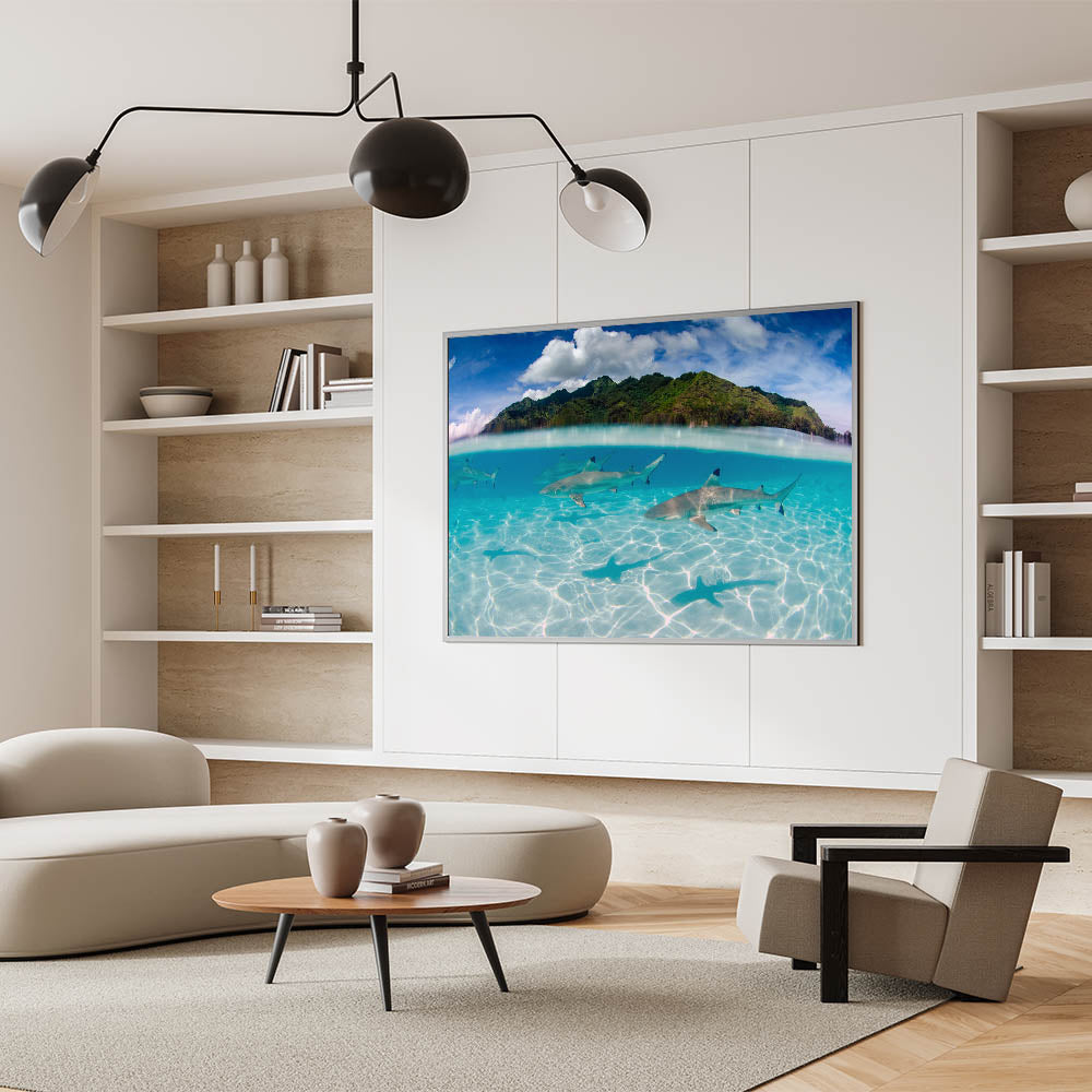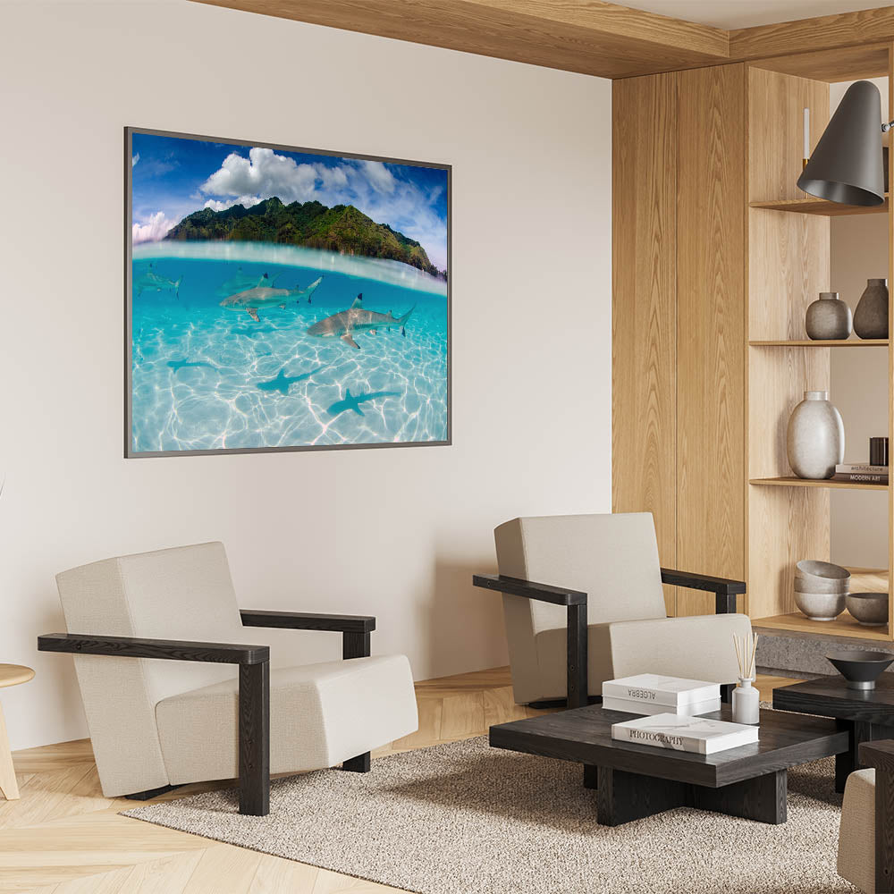 Dive into the deep blue with our "Tahiti Shark Waters - Underwater Adventure Canvas Print." This stunning piece captures the thrilling sight of sharks gracefully gliding through the crystal-clear waters of Tahiti, set against the lush, green mountainous landscape above.