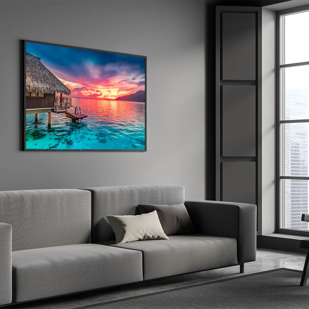Embrace the serene beauty of a Tahitian sunset with our "Tahiti Sunset Bliss - Overwater Bungalow Canvas Art." This captivating print showcases an overwater bungalow bathed in the vibrant hues of a sunset, reflecting off the tranquil waters, with dramatic mountain silhouettes in the background.
