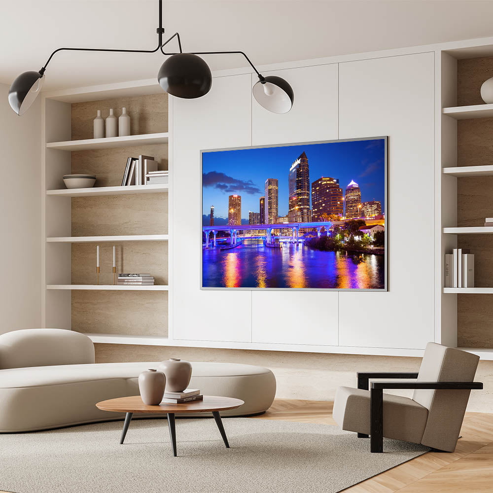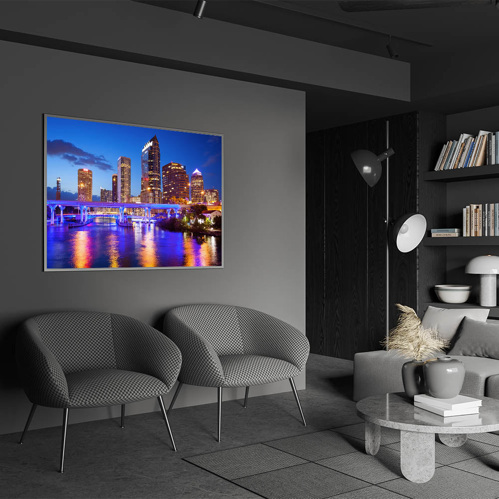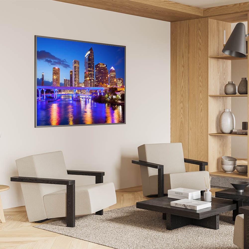 - Stunning nighttime Tampa skyline photography, ideal for adding a bold and vibrant touch to your decor