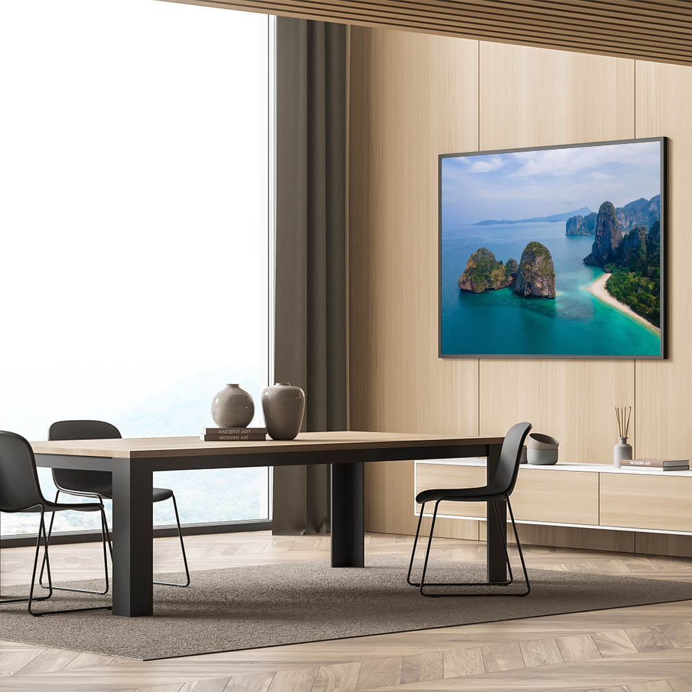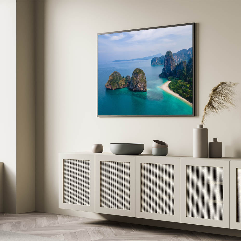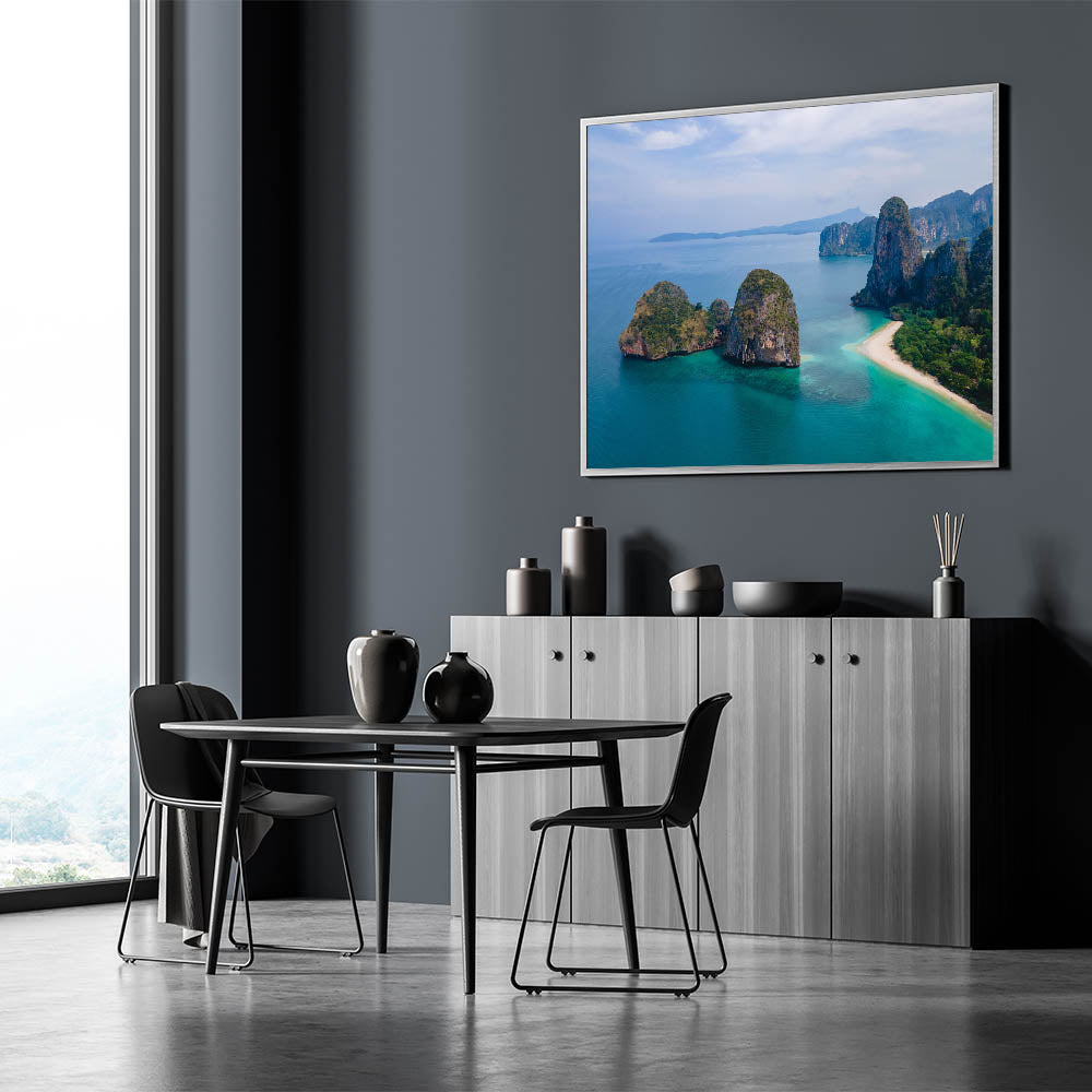 Elevate your decor with "Thailand’s Coastal Islands Aerial Canvas Art." This captivating artwork showcases a serene aerial perspective of Thailand’s lush coastal islands, highlighting their turquoise waters and rugged cliffs. It's an invitation to explore the untouched beauty of these remote paradises from the comfort of your home.