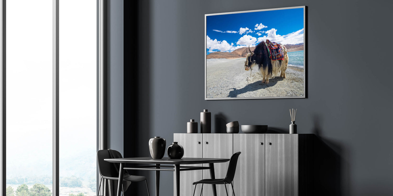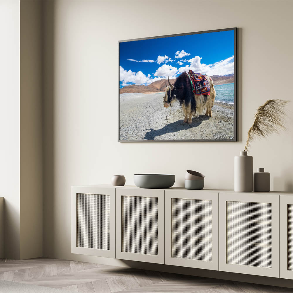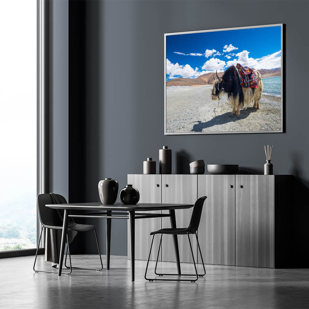 Capture the essence of Tibetan culture with this unique wall art featuring a beautifully adorned yak by a serene lakeside, set against the majestic Tibetan mountains. This piece transports you to the heart of Tibet, blending natural beauty with cultural richness. Perfect for nature lovers and cultural enthusiasts, this artwork makes an impressive statement in any home or office.