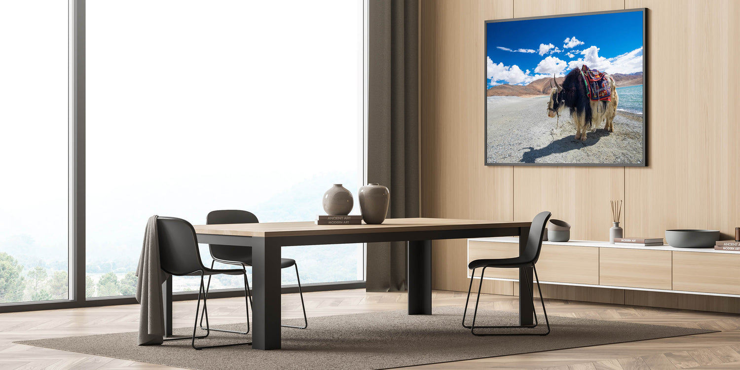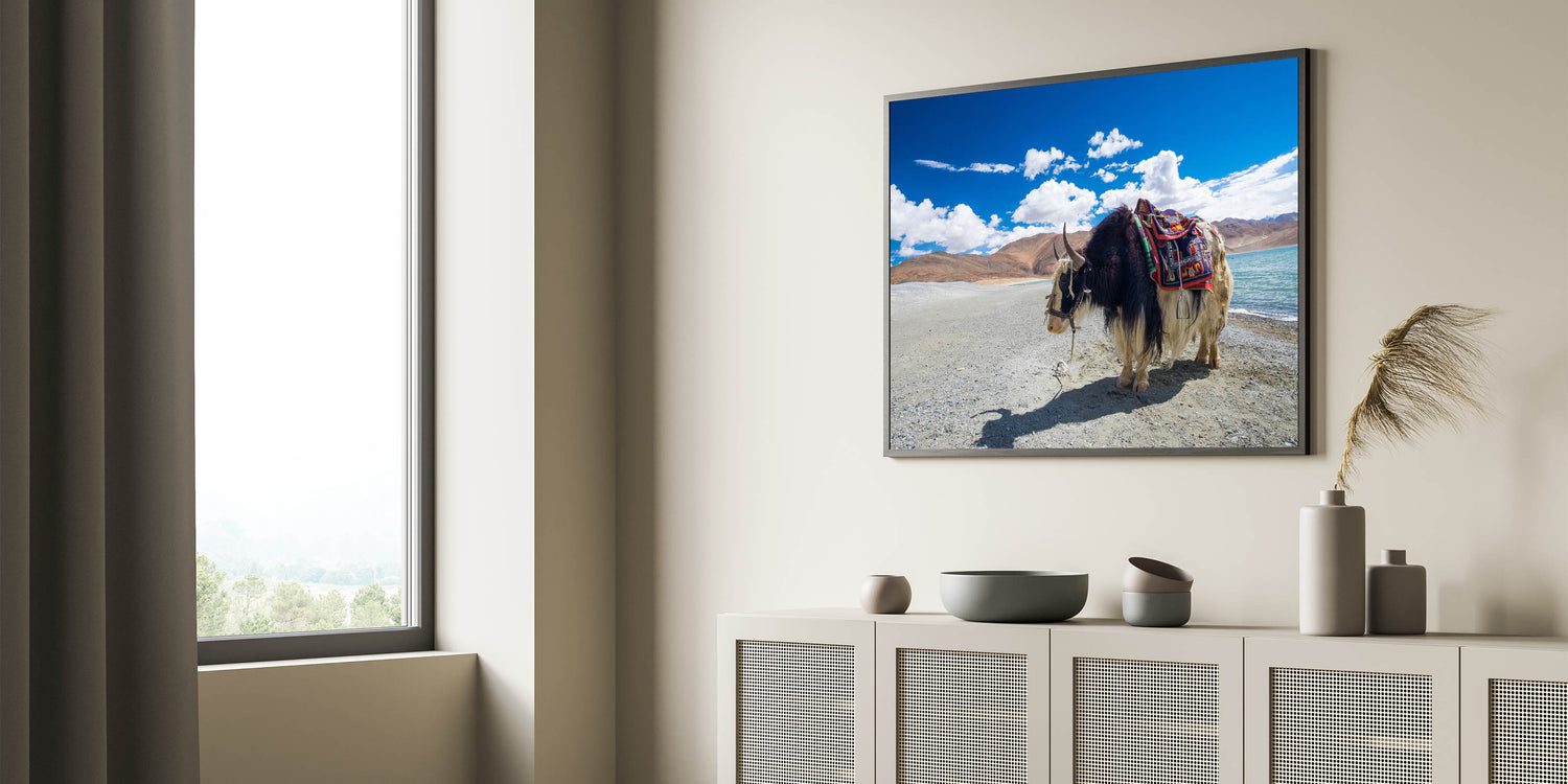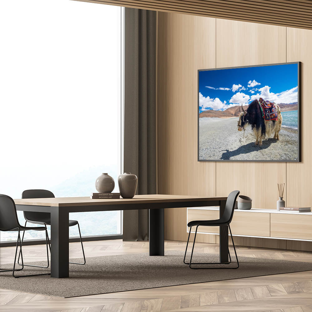 Capture the essence of Tibetan culture with this unique wall art featuring a beautifully adorned yak by a serene lakeside, set against the majestic Tibetan mountains. This piece transports you to the heart of Tibet, blending natural beauty with cultural richness. Perfect for nature lovers and cultural enthusiasts, this artwork makes an impressive statement in any home or office.