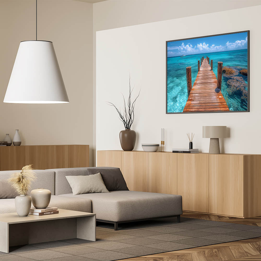 Experience the serene beauty of the ocean with this stunning Cancun pier wall art. Featuring a tranquil wooden pier stretching into the crystal-clear turquoise waters of the Caribbean, this artwork brings a sense of peace and calm to any space. Whether you're decorating your living room, bedroom, or a coastal-themed room, this high-quality Cancun beach print is perfect for adding a touch of tropical tranquility to your decor.