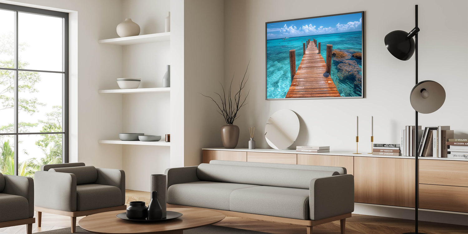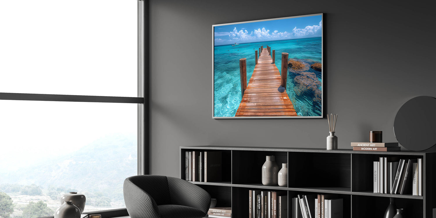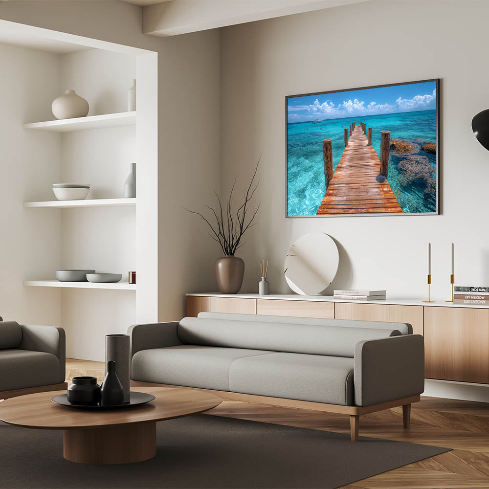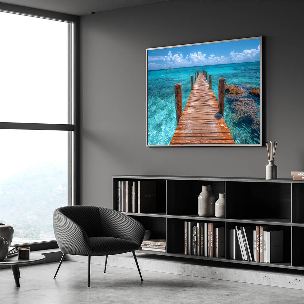 Bring the relaxing atmosphere of a tropical vacation into your home with this Cancun pier photography. The vibrant blue water and warm wooden tones create a soothing aesthetic, perfect for creating a calming environment in any room.