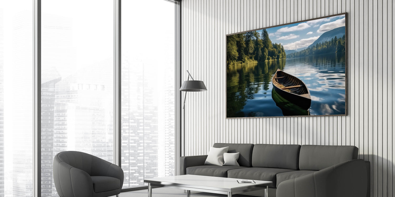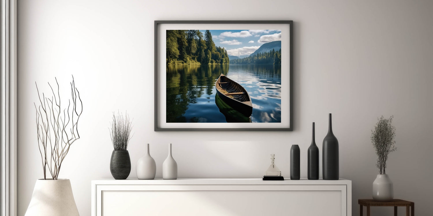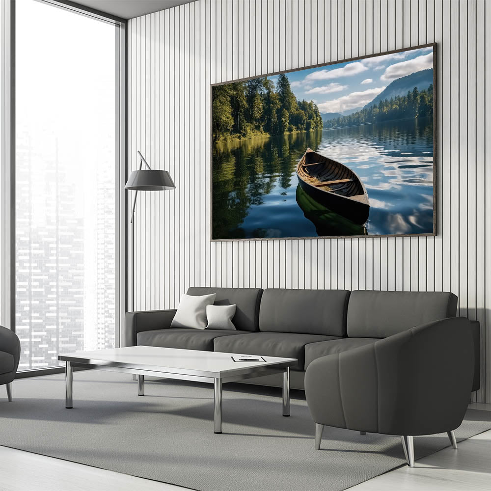 Tranquil Lake Wall Art with Wooden Boat - Serene Lakeside Print