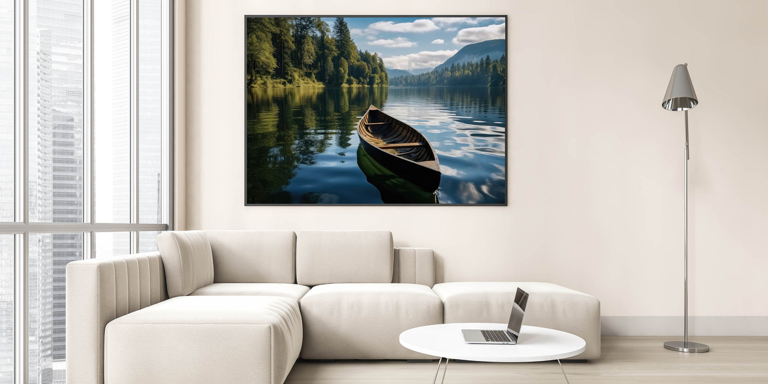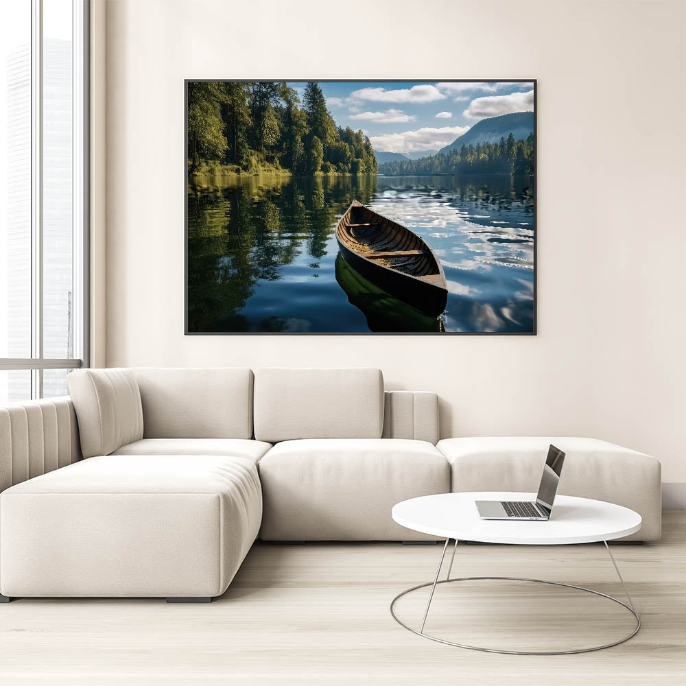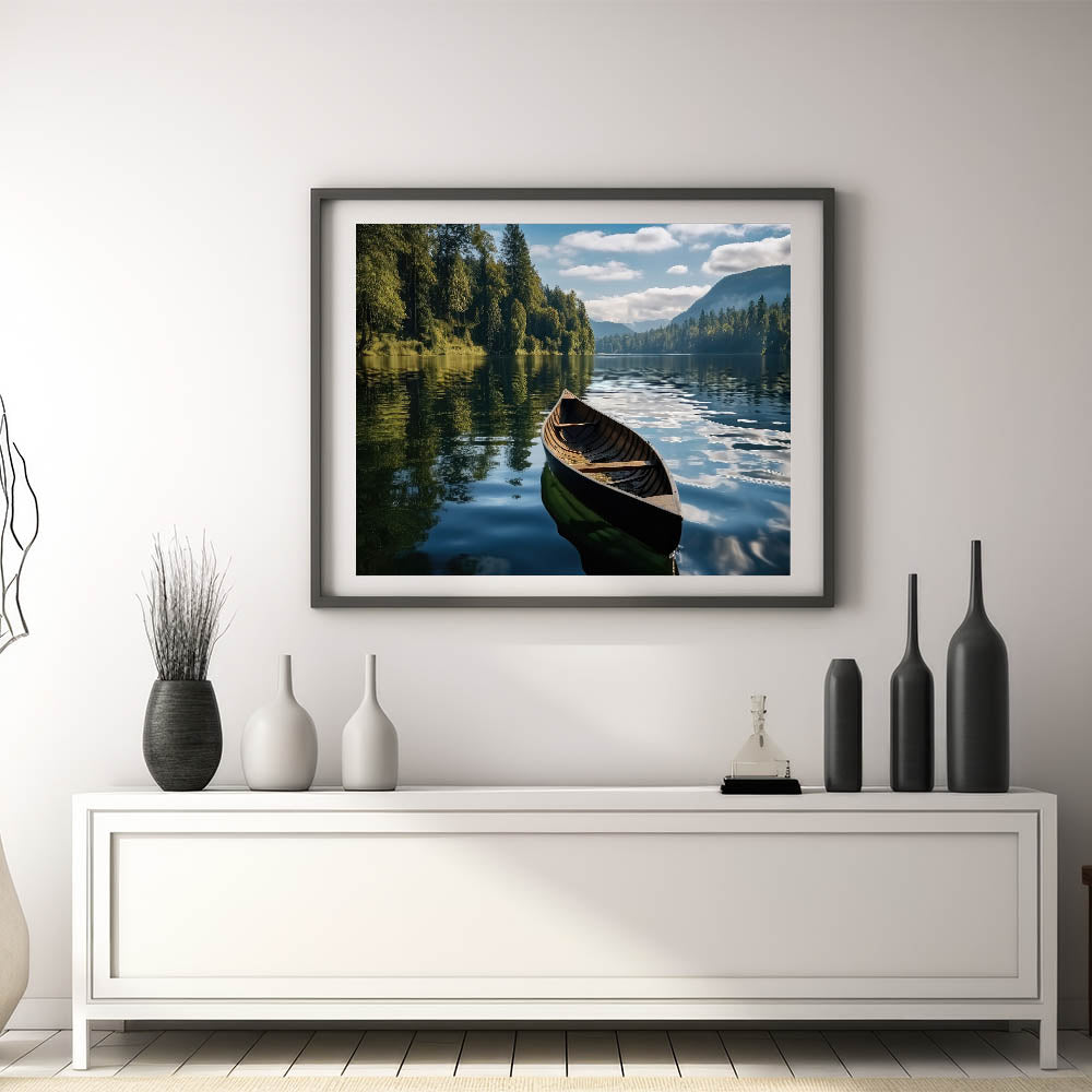 Immerse yourself in the calming beauty of this tranquil lake wall art, featuring a serene lakeside scene with a rustic wooden boat gently floating on crystal-clear waters. The lush green forest surrounding the lake is perfectly reflected in the calm water, creating a harmonious balance between nature and serenity. This piece is ideal for those seeking to bring the peacefulness of nature into their home or office decor.