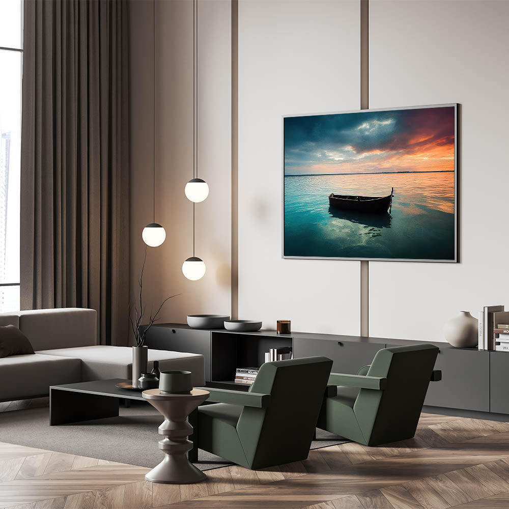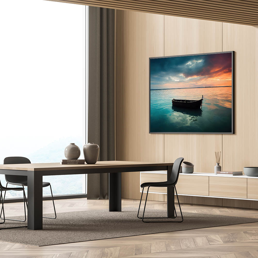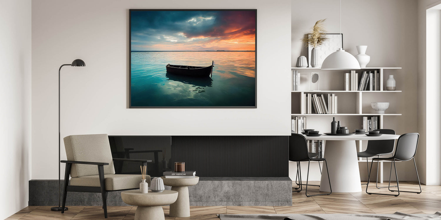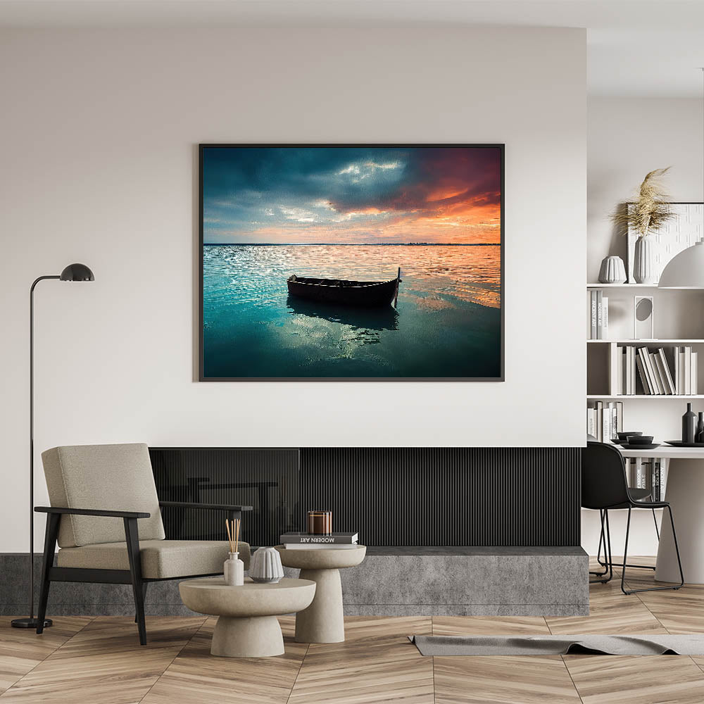 Embrace the calmness of twilight with this captivating rowboat wall art. This stunning piece showcases a lone rowboat floating peacefully on serene waters, as the sky transitions from warm sunset hues to the deep blues of evening. The interplay of light and shadow creates a mesmerizing contrast, making this artwork a perfect addition to any space that seeks to evoke a sense of relaxation and tranquility. Ideal for beach homes or nautical-themed interiors, this handcrafted boat art is available in a variety of high-quality materials, including Stretched Canvas, Framed Canvas, Acrylic Glass, Framed Acrylic Glass, Framed Print, Rolled Canvas, and Rolled Print.