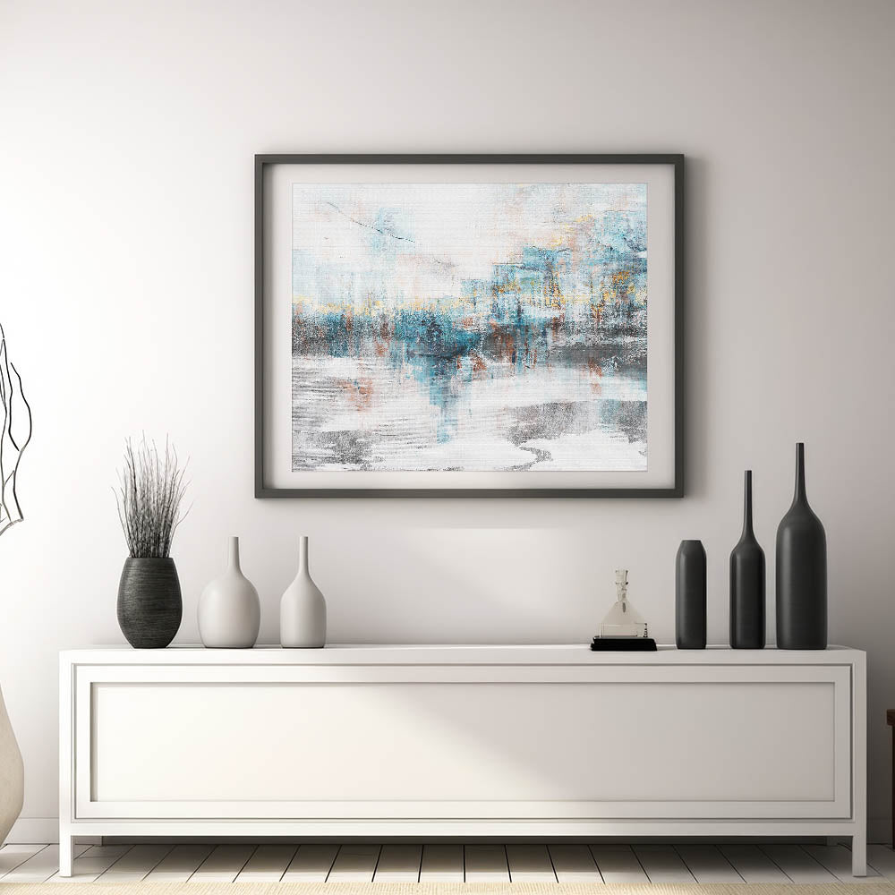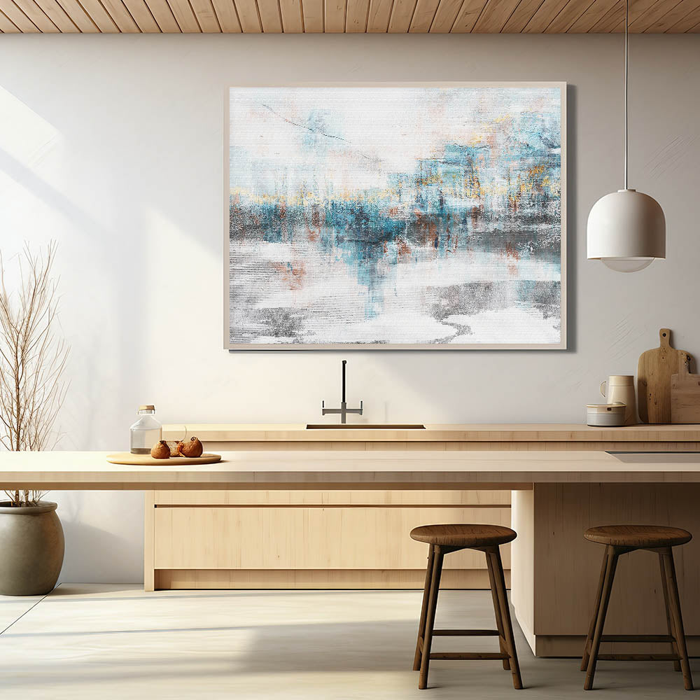 Immerse yourself in the serene beauty of this tranquil strokes and lines abstract art. Featuring a calming palette of blue, beige, and subtle gold accents, this artwork evokes a sense of peaceful reflection. The soft brush strokes and delicate lines create a harmonious blend of colors, reminiscent of a quiet landscape or a serene waterscape, making it an ideal addition to any space in need of a calming influence.