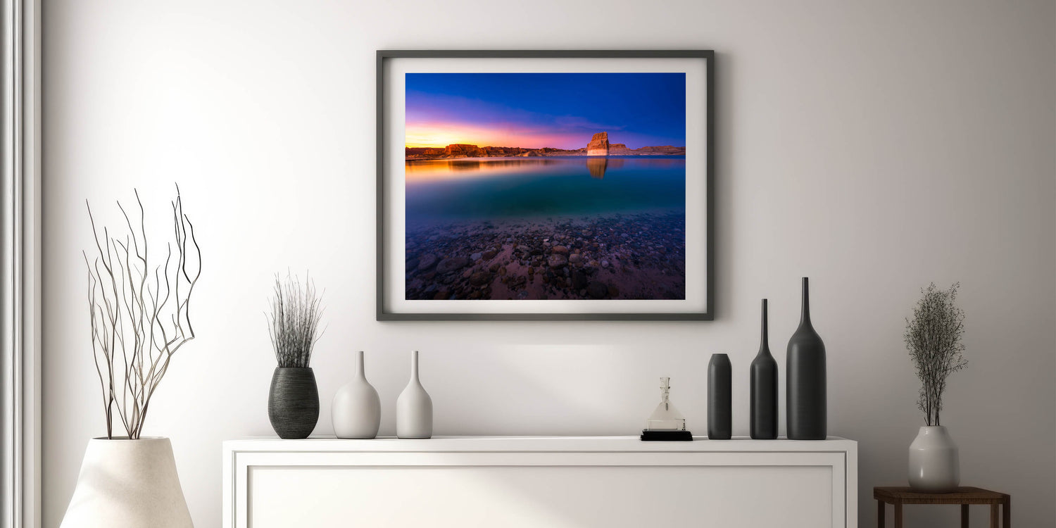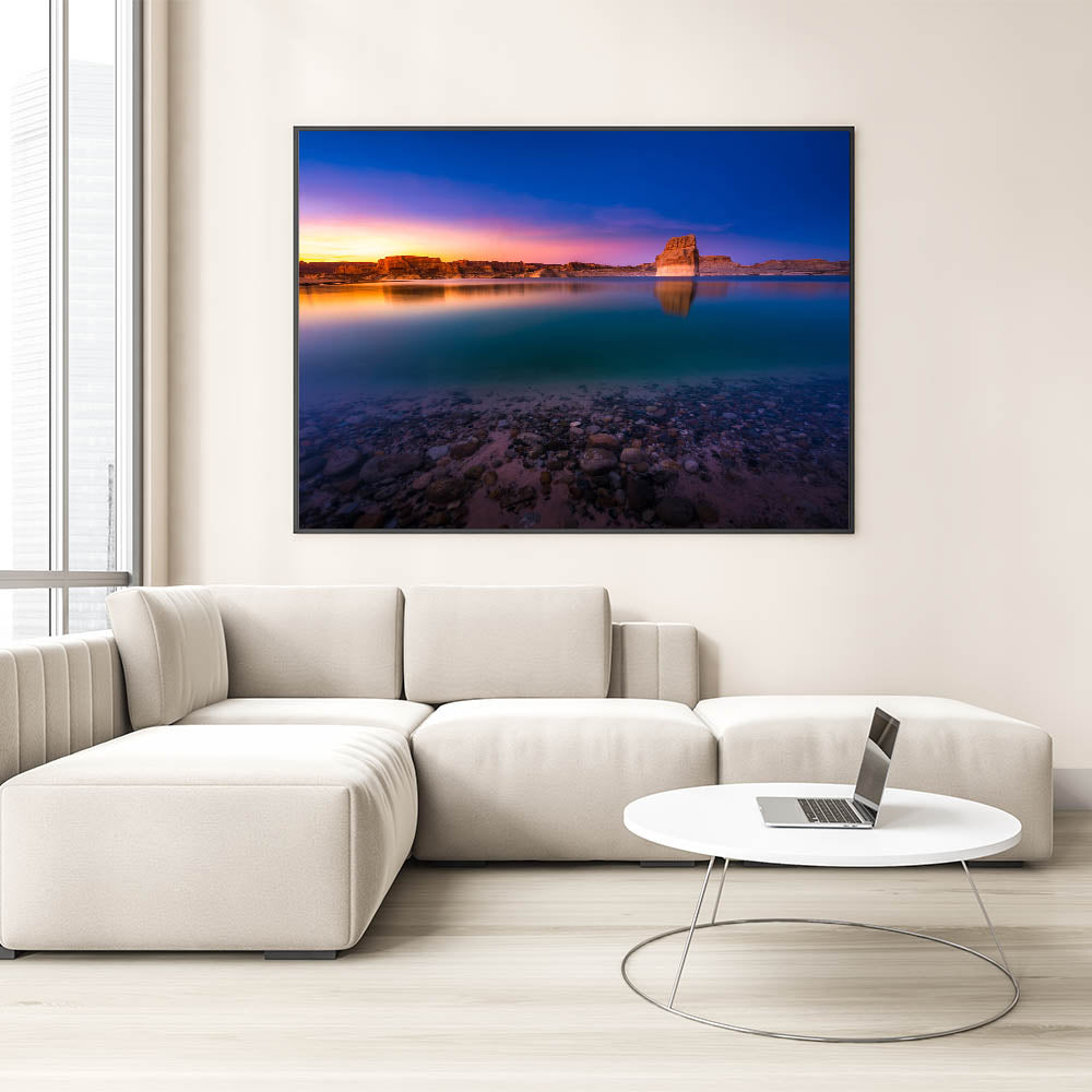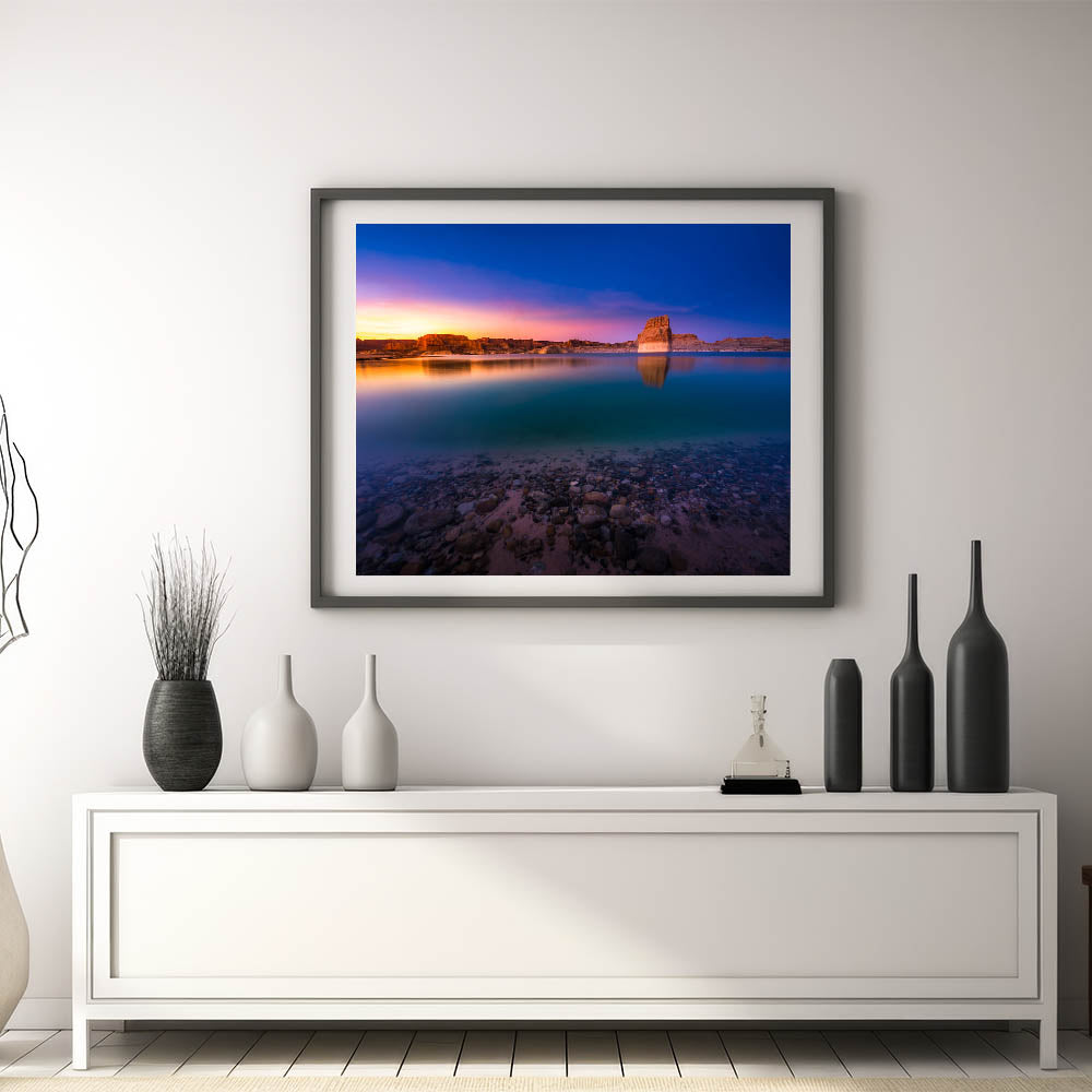 Whether you're looking for a calming accent for your decor or a bold statement piece, this Lake Powell landscape art will transform your space with the soothing colors of sunset and nature's majesty.