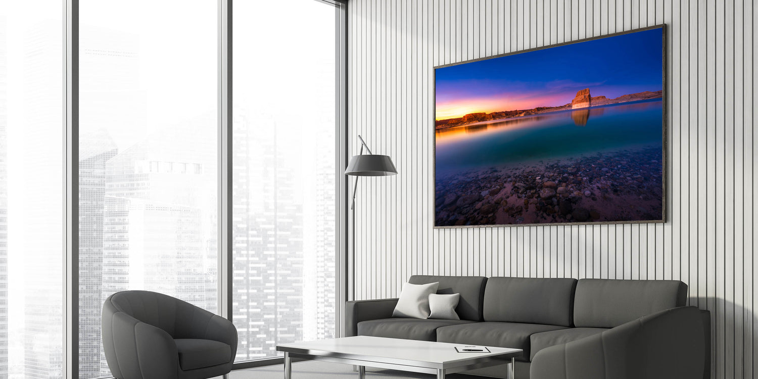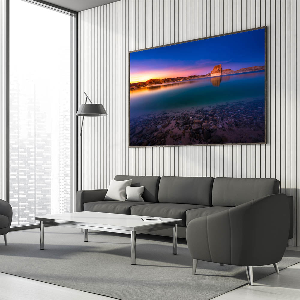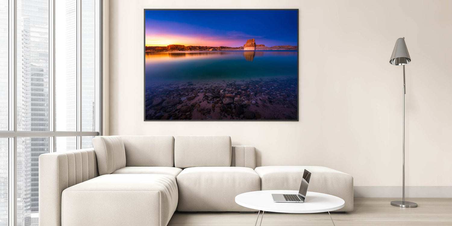 Whether you're looking for a calming accent for your decor or a bold statement piece, this Lake Powell landscape art will transform your space with the soothing colors of sunset and nature's majesty.