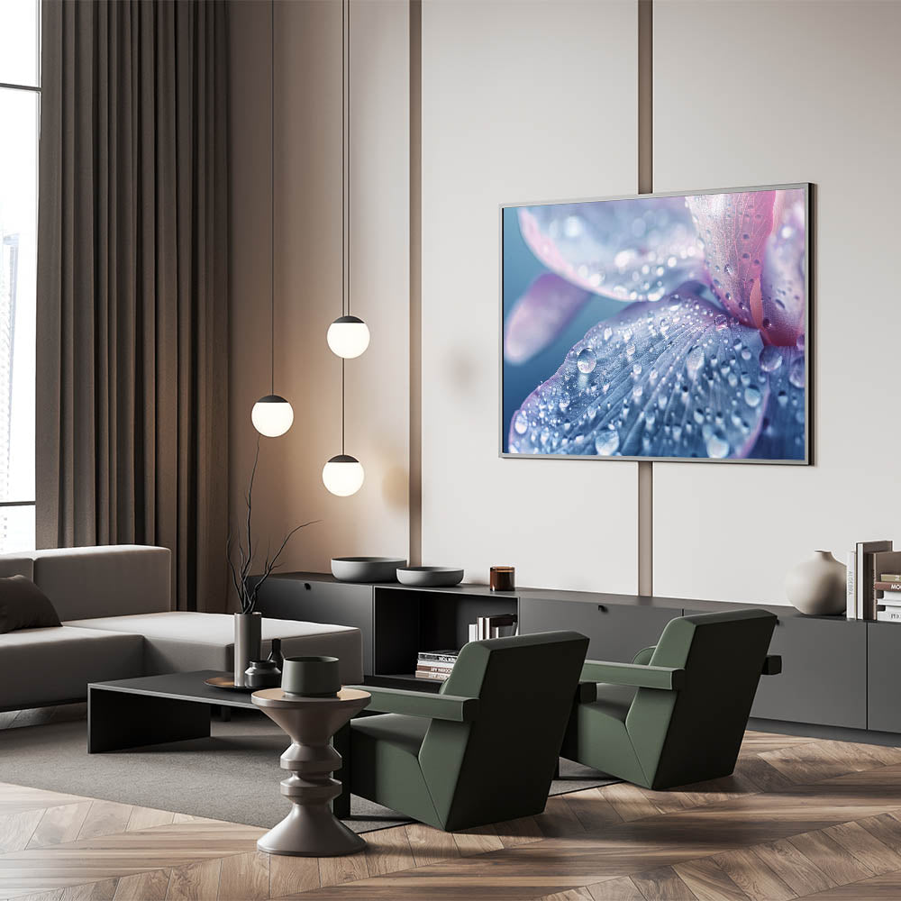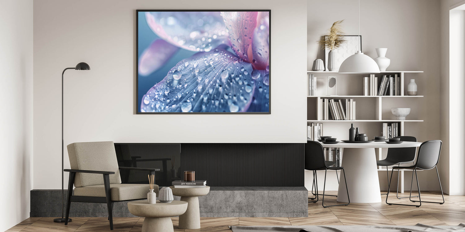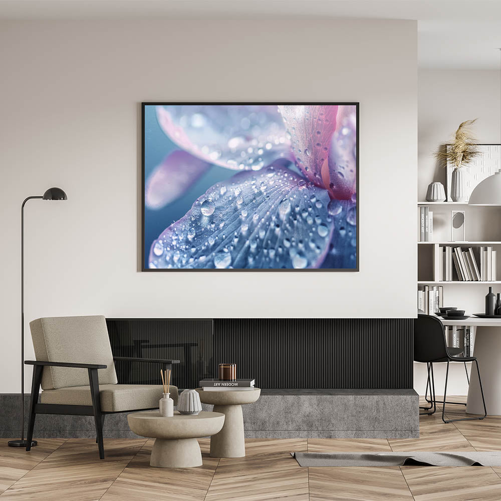 Perfect for lovers of nature close-up prints and calming water photography, this artwork adds a sophisticated, serene touch to any living room, bedroom, or office. Its soft hues of blue, lavender, and pink, combined with the intricate details of water droplets, make it an elegant and peaceful addition to your collection.