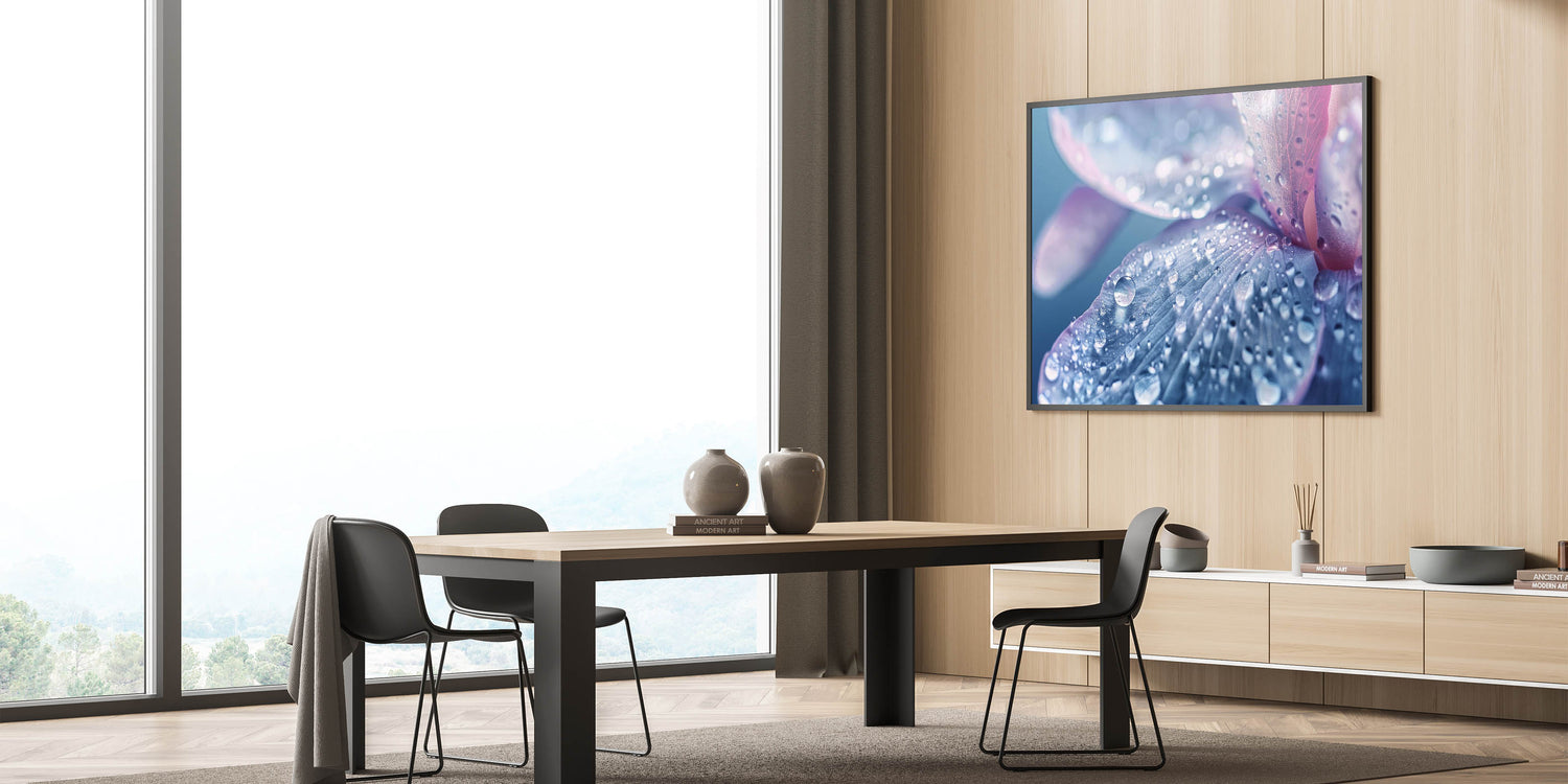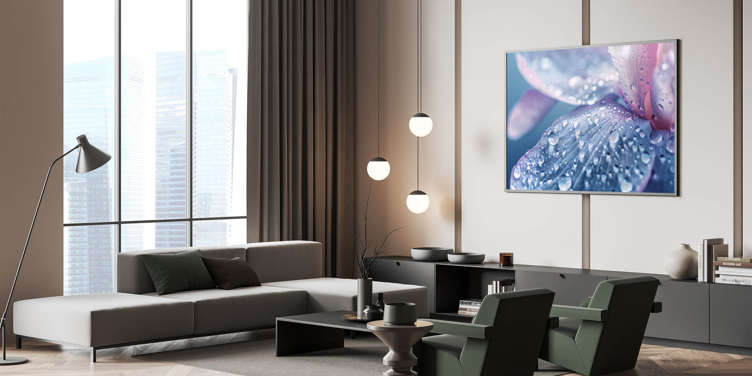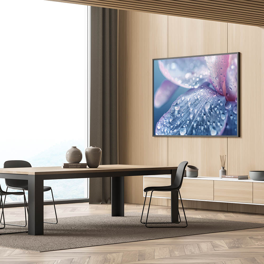 Perfect for lovers of nature close-up prints and calming water photography, this artwork adds a sophisticated, serene touch to any living room, bedroom, or office. Its soft hues of blue, lavender, and pink, combined with the intricate details of water droplets, make it an elegant and peaceful addition to your collection.
