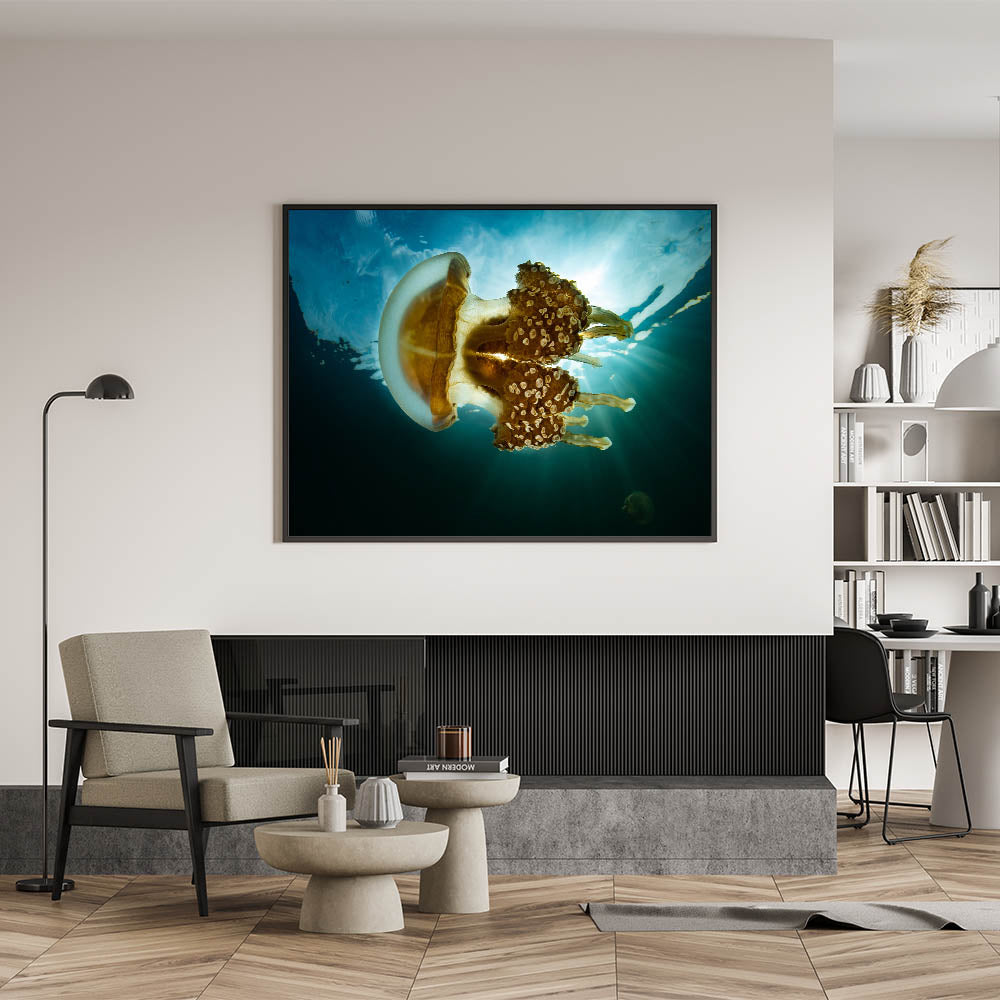 Discover the sublime beauty of the deep with our "Translucent Jellyfish Glow Art" from the Unique Pacific Ocean Art Pieces collection. This print captures a mesmerizing jellyfish, floating gracefully beneath the water's surface, illuminated by the natural light filtering through from above.