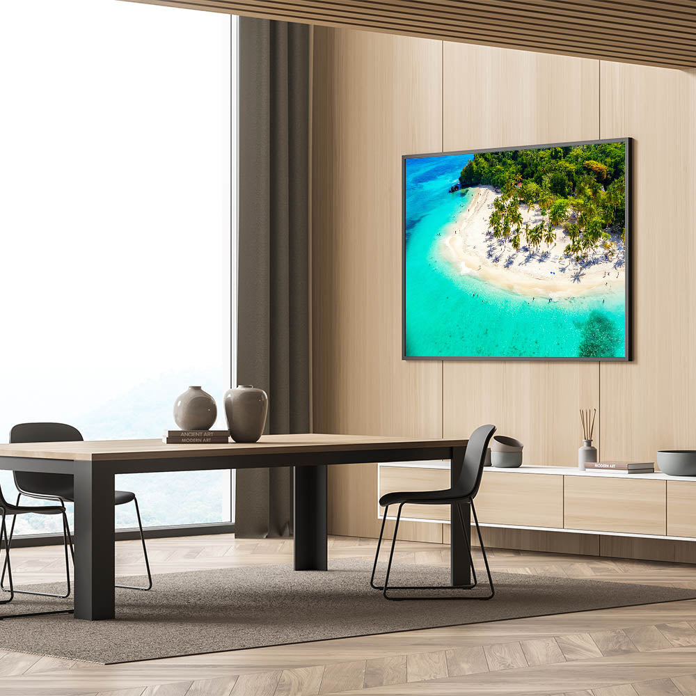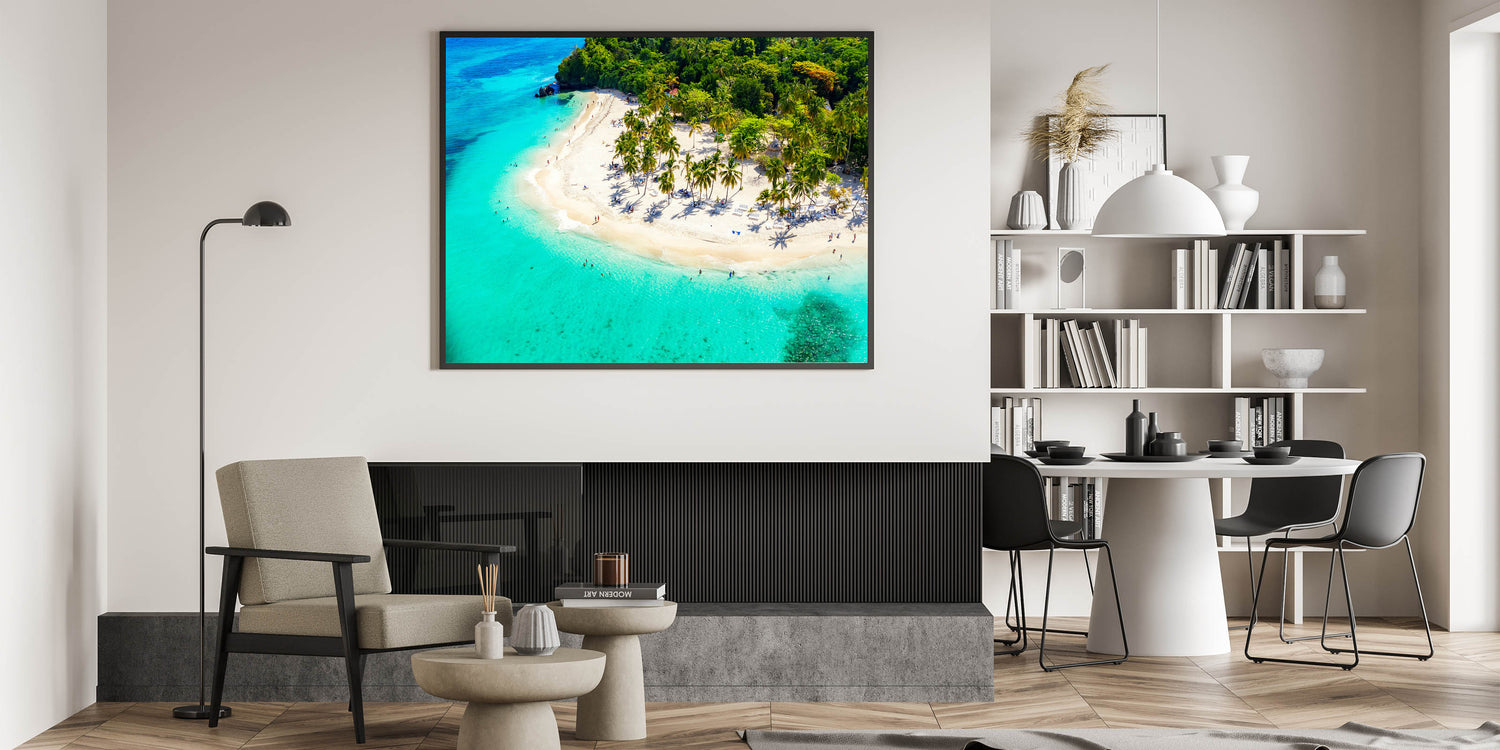 Elevate your interior with the vibrant beauty of this tropical beach aerial view wall art, showcasing a pristine shoreline dotted with swaying palm trees and surrounded by crystal-clear turquoise waters. Captured from above, this stunning scene offers a unique perspective on an idyllic island paradise, making it the perfect piece for anyone looking to bring the essence of the tropics into their home. Ideal for living rooms, bedrooms, or offices, this artwork adds a refreshing and lively touch to any space.