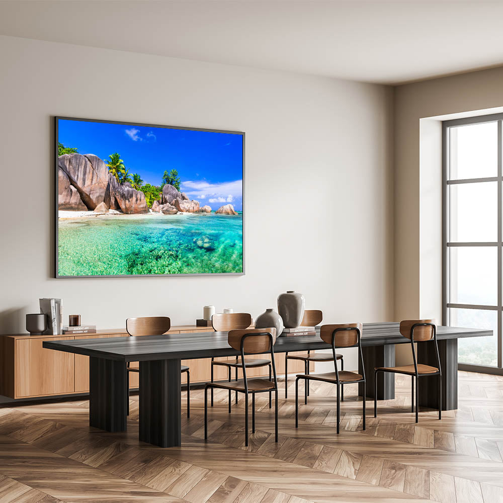 Escape to a tropical paradise with this stunning beach landscape wall art featuring majestic granite rocks and crystal-clear waters. This vibrant artwork captures the natural beauty of a pristine beach where the striking contrast between the rugged rocks and the tranquil turquoise sea creates a captivating scene. The lush greenery and bright blue sky further enhance the tropical atmosphere, making this piece a perfect addition to any coastal or nature-inspired decor.