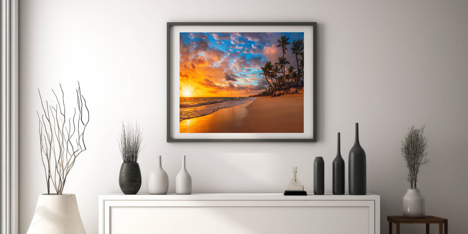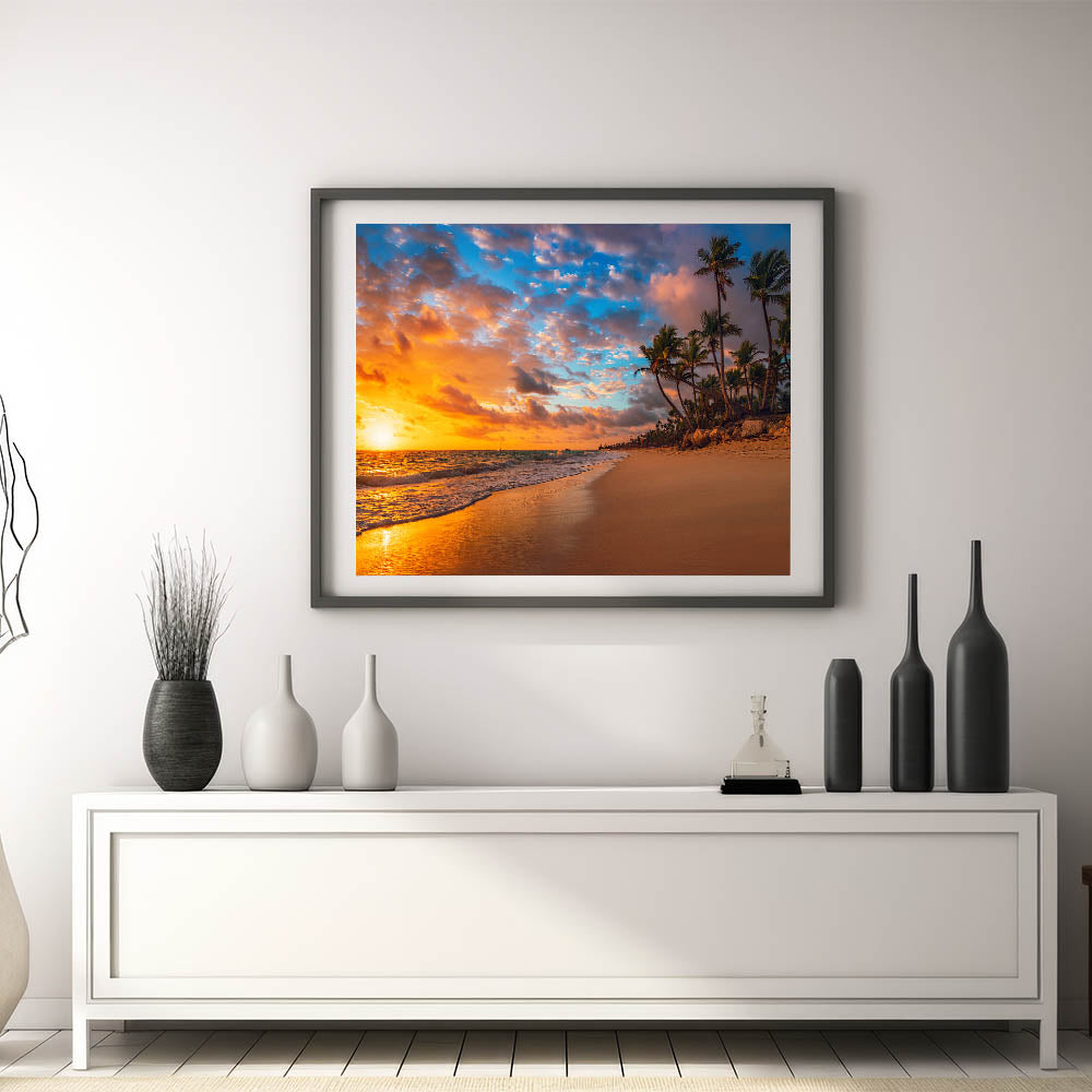 Bask in the warm hues of a stunning tropical sunset with this breathtaking piece of Palm Beach wall art. This ocean view art print captures the beauty of the setting sun as it illuminates the sky with vibrant oranges, pinks, and blues, reflecting over the tranquil waves. The lush palm trees lining the beach add to the sense of tropical paradise, making this a perfect addition to any coastal wall decor.