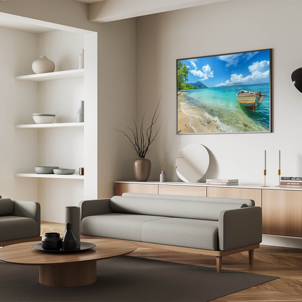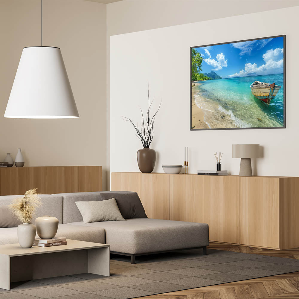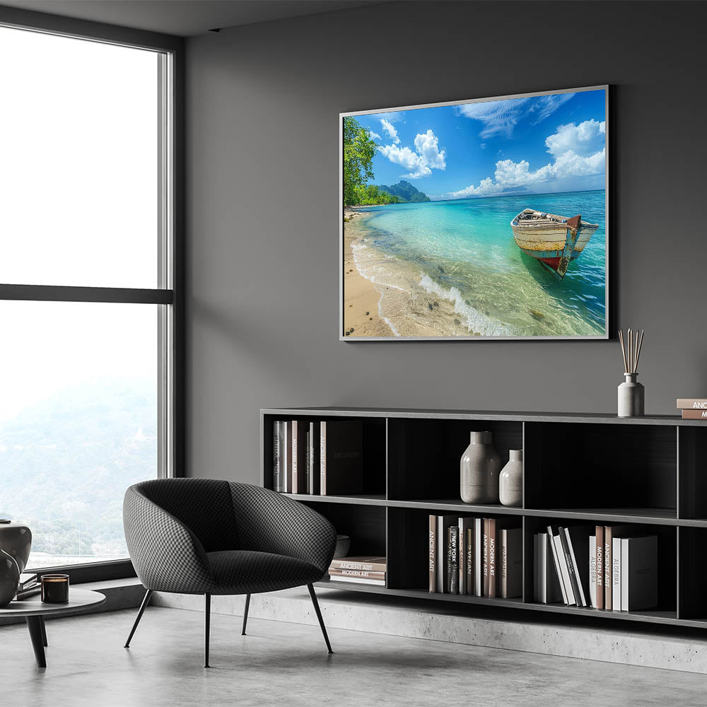 Tropical Island Prints – Boat on Tranquil Beach with Turquoise Waters