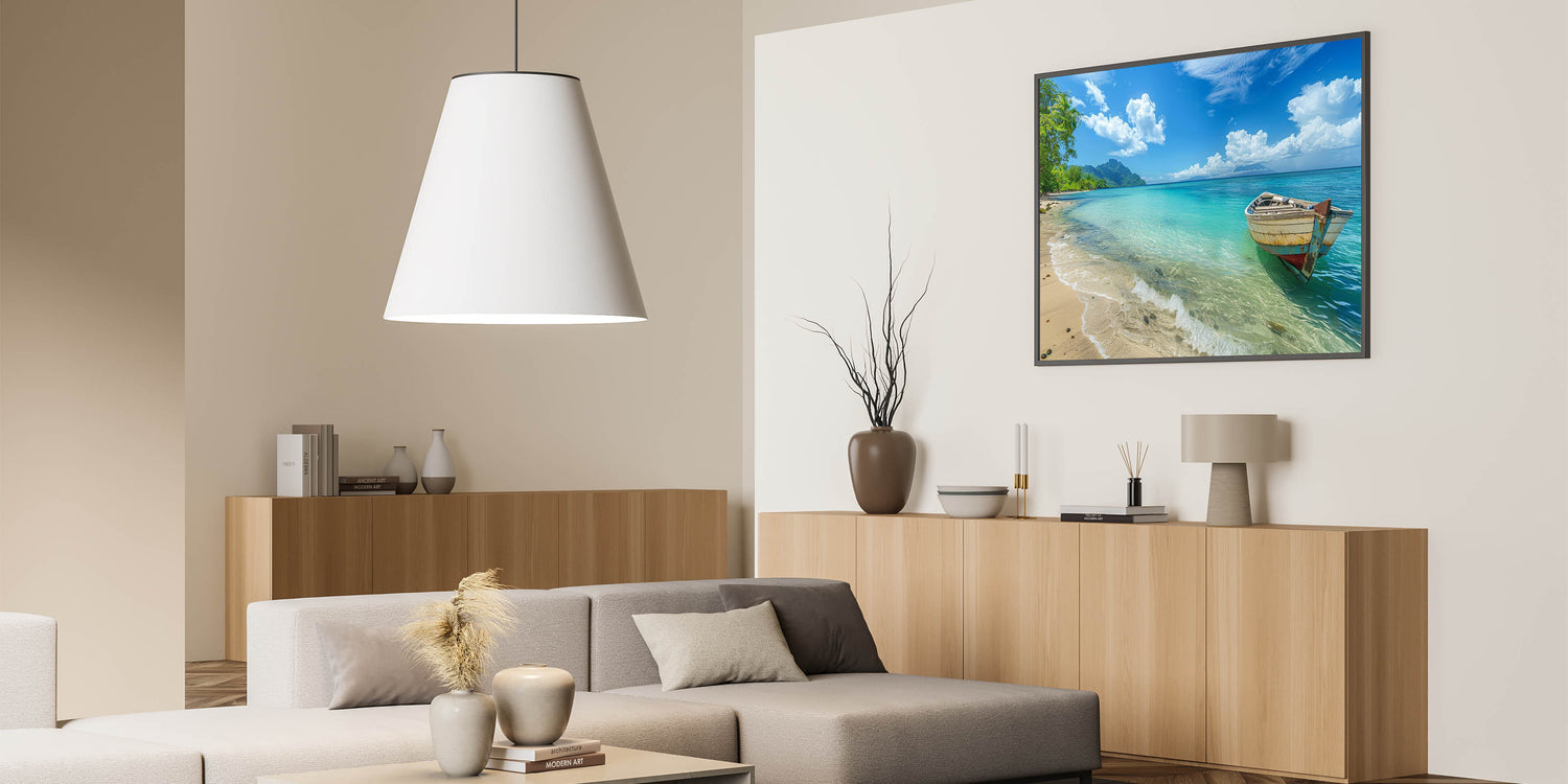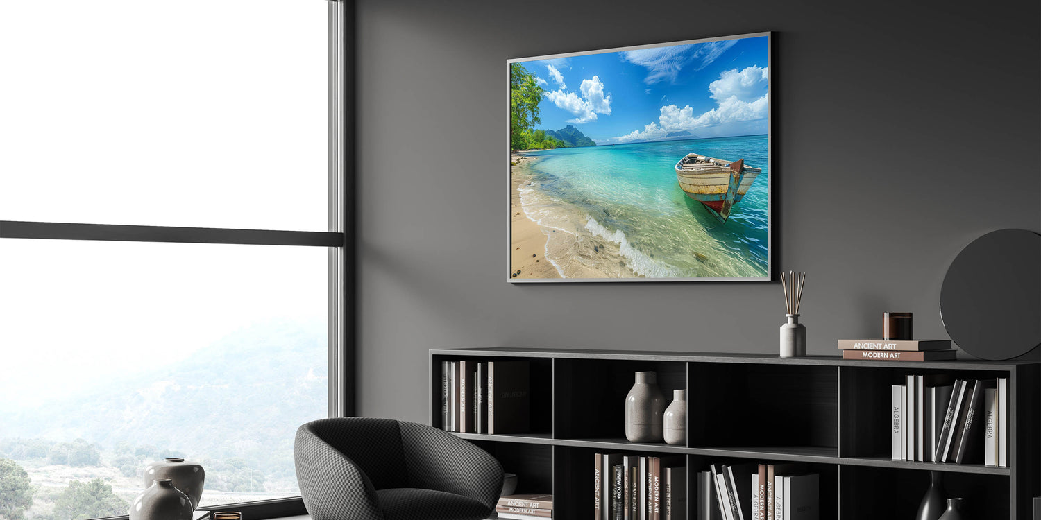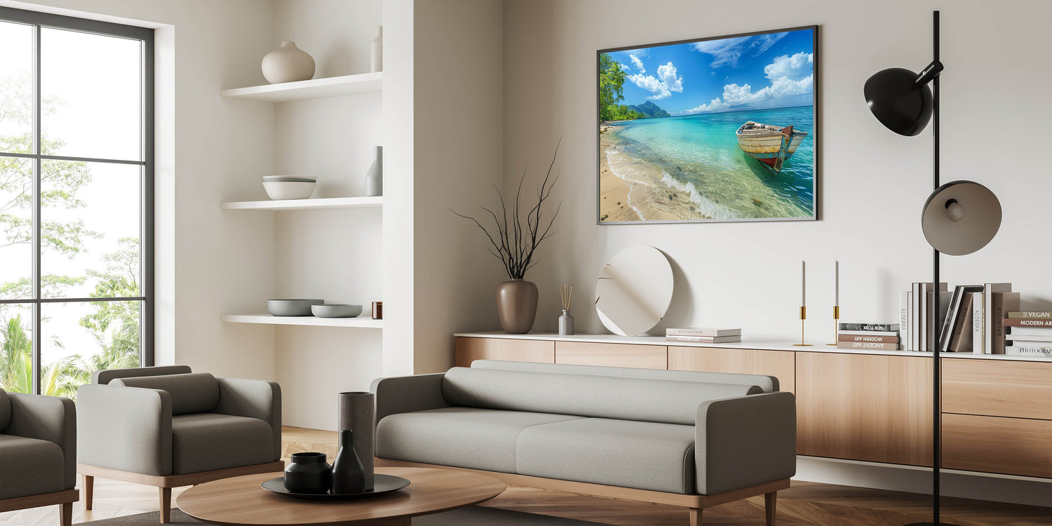 Tropical Island Prints – Boat on Tranquil Beach with Turquoise Waters