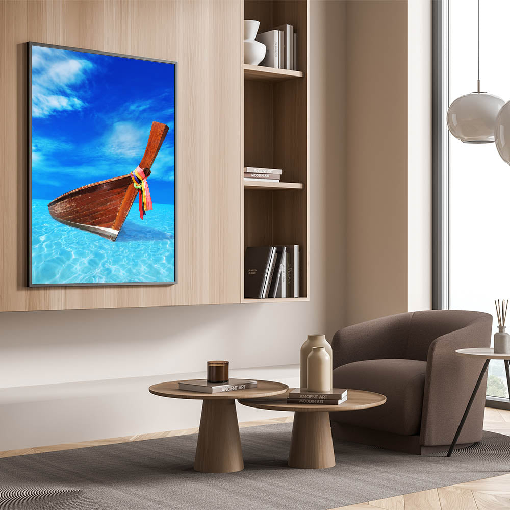 Bring the vibrant charm of the Caribbean to your home with this stunning Barbados wall art, featuring a wooden boat resting in crystal-clear turquoise waters under a brilliant blue sky. This captivating tropical scene perfectly embodies the beauty and serenity of island life, making it an ideal addition to any coastal or nautical-themed decor. The sharp contrast between the rustic boat and the serene water creates a visually stunning piece that will captivate attention in any space.