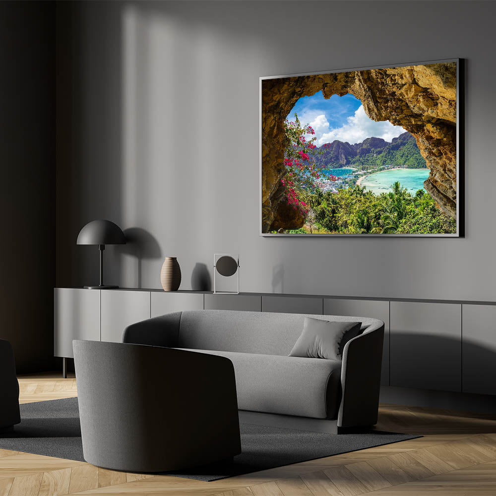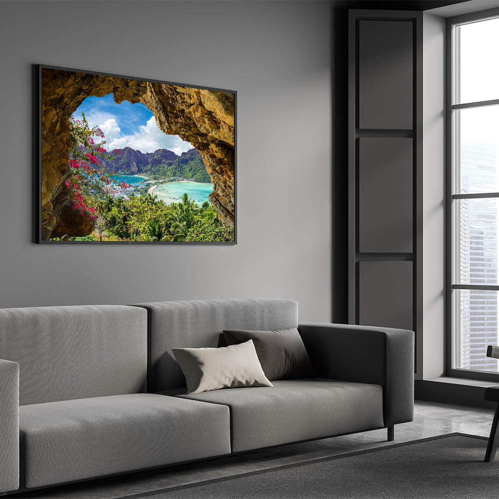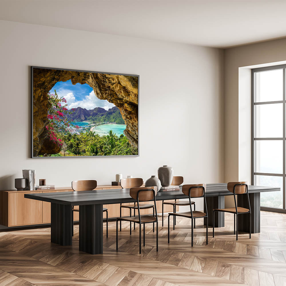Step into a tropical paradise with this breathtaking Village landscape painting that captures the vibrant beauty of a coastal village as seen through a natural rock archway. The view reveals lush greenery, crystal-clear waters, and colorful village rooftops, all framed by the rugged textures of the rocky cliff. This Village scene wall decor brings the warmth and tranquility of a tropical escape right into your home.