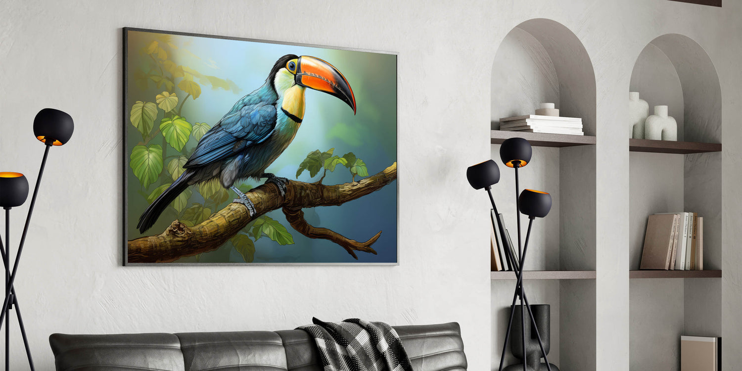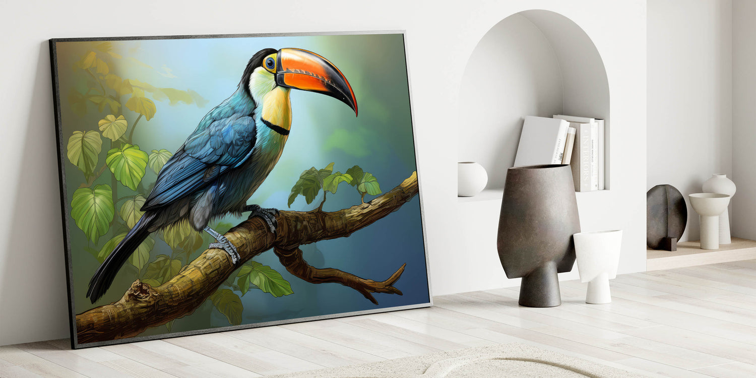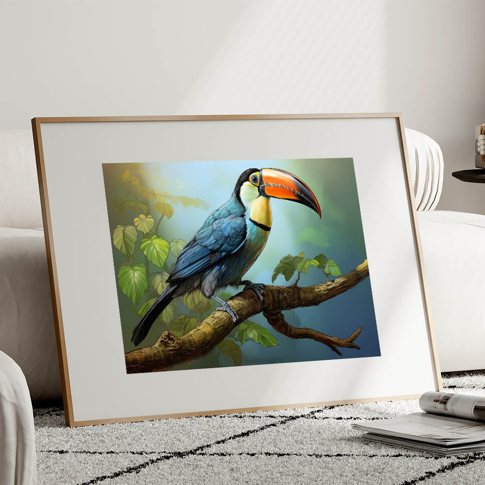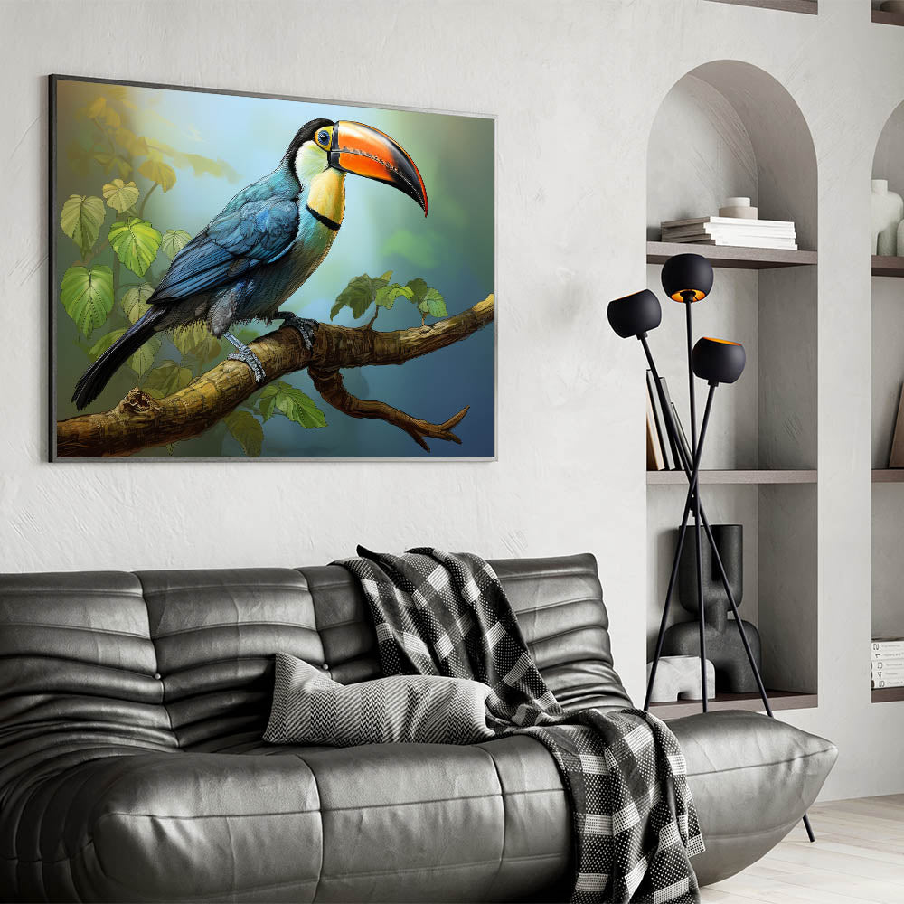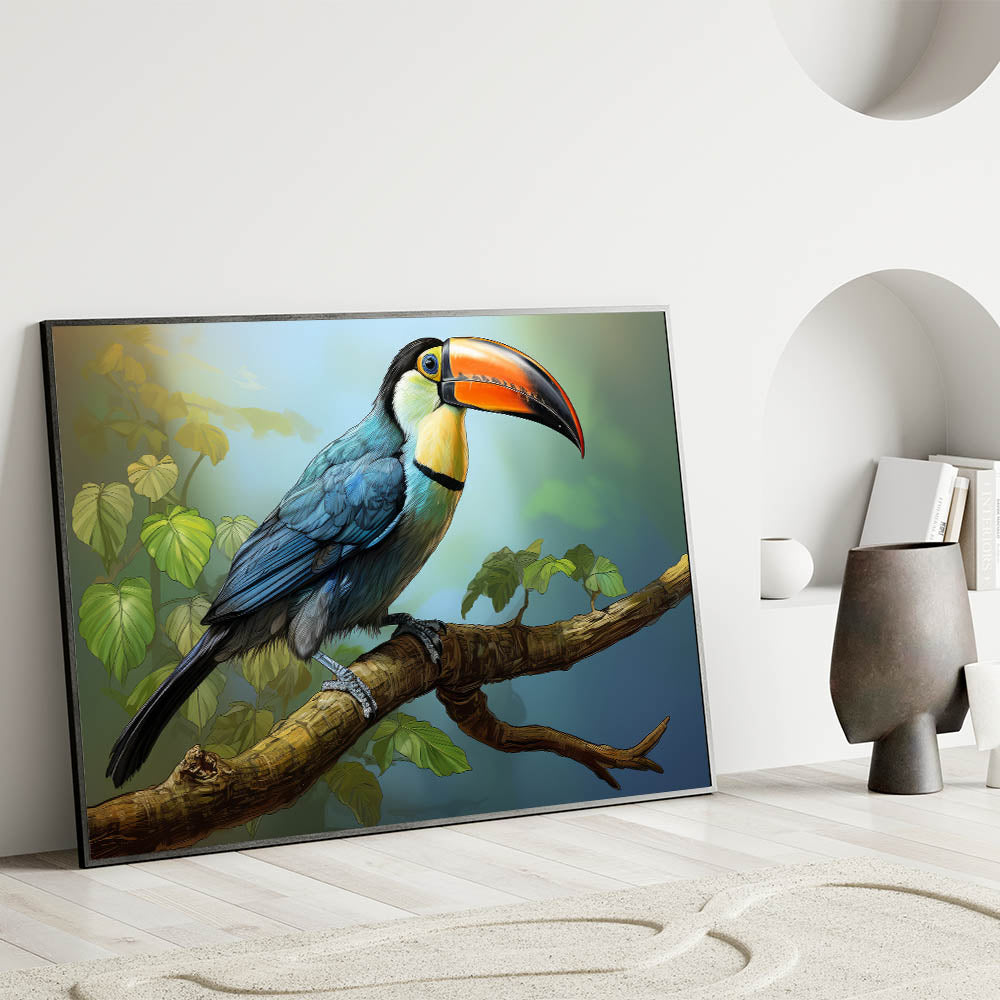 Bring the lush beauty of the tropics into your home with this Tropical Toucan Wall Art. This stunning artwork features a toucan perched on a branch amidst a verdant background, showcasing the bird's vibrant blue, yellow, and orange feathers in exquisite detail. The rich colors and natural setting make this piece a perfect addition to any room that could use a touch of the exotic.