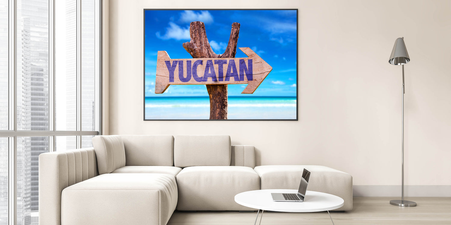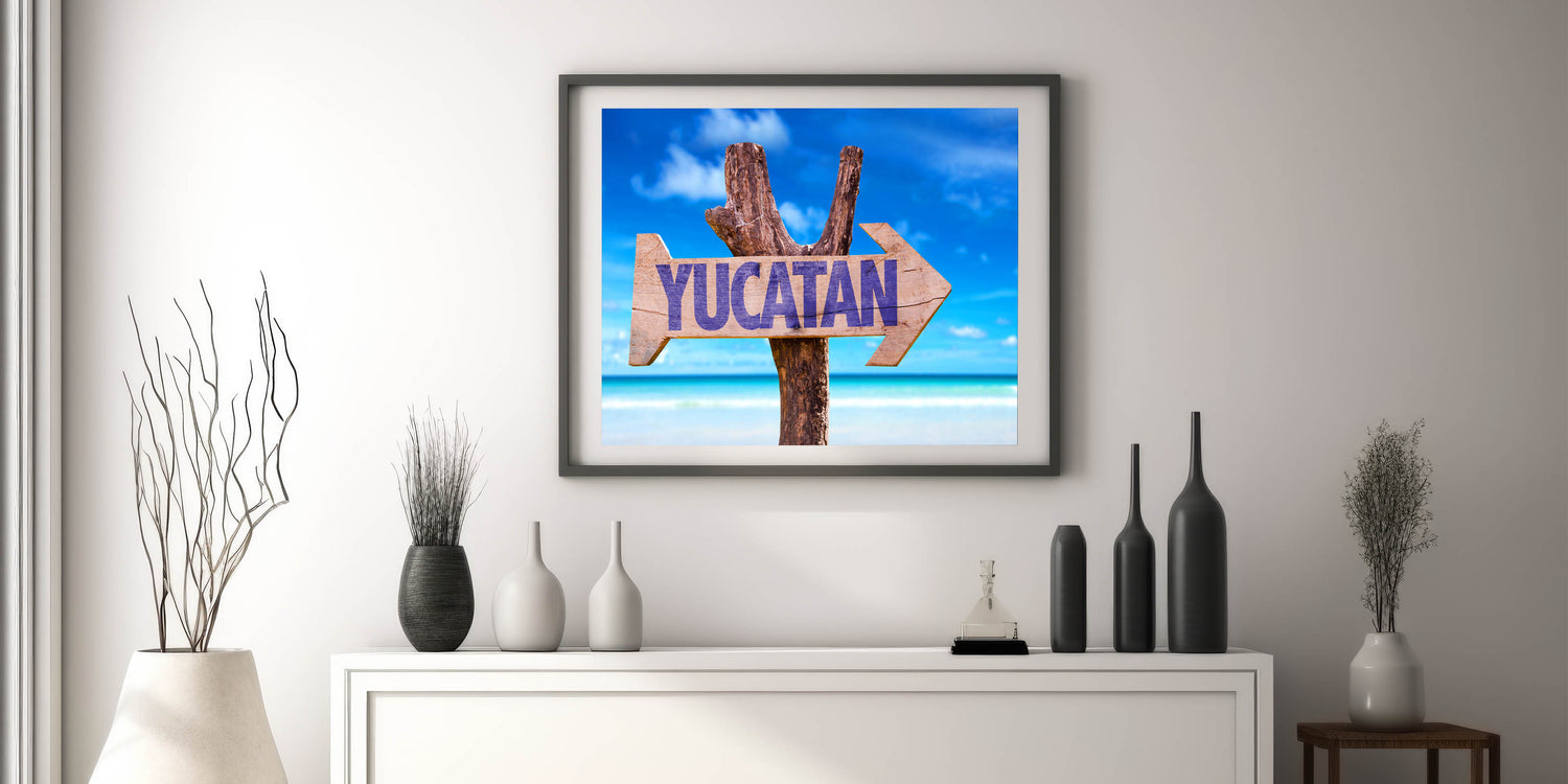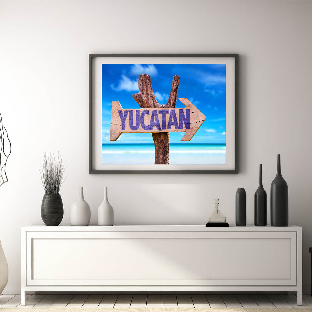 Bring the essence of the Yucatan Peninsula into your home with this vibrant Tropical Yucatan scene. Featuring a rustic sign with "Yucatan" against the backdrop of the stunning tropical beaches and clear blue skies, this Mexico Yucatan print adds a splash of vibrant coastal beauty to any space. Ideal for those who love to travel or want to bring the tropical paradise of Yucatan into their living space, this Yucatan Peninsula decor piece encapsulates the natural charm of this Mexican region.