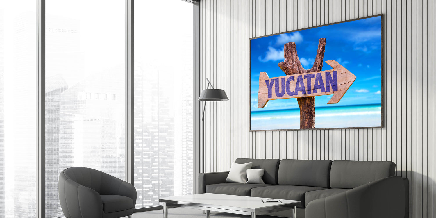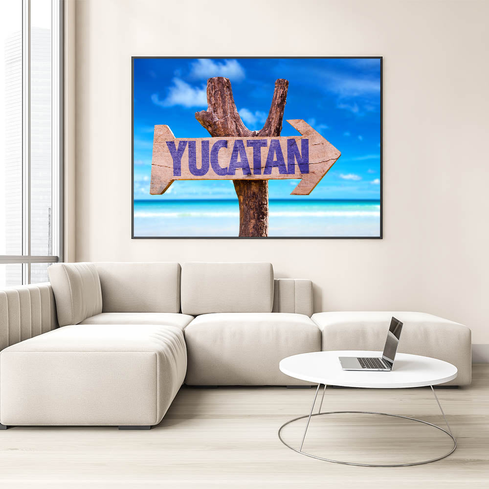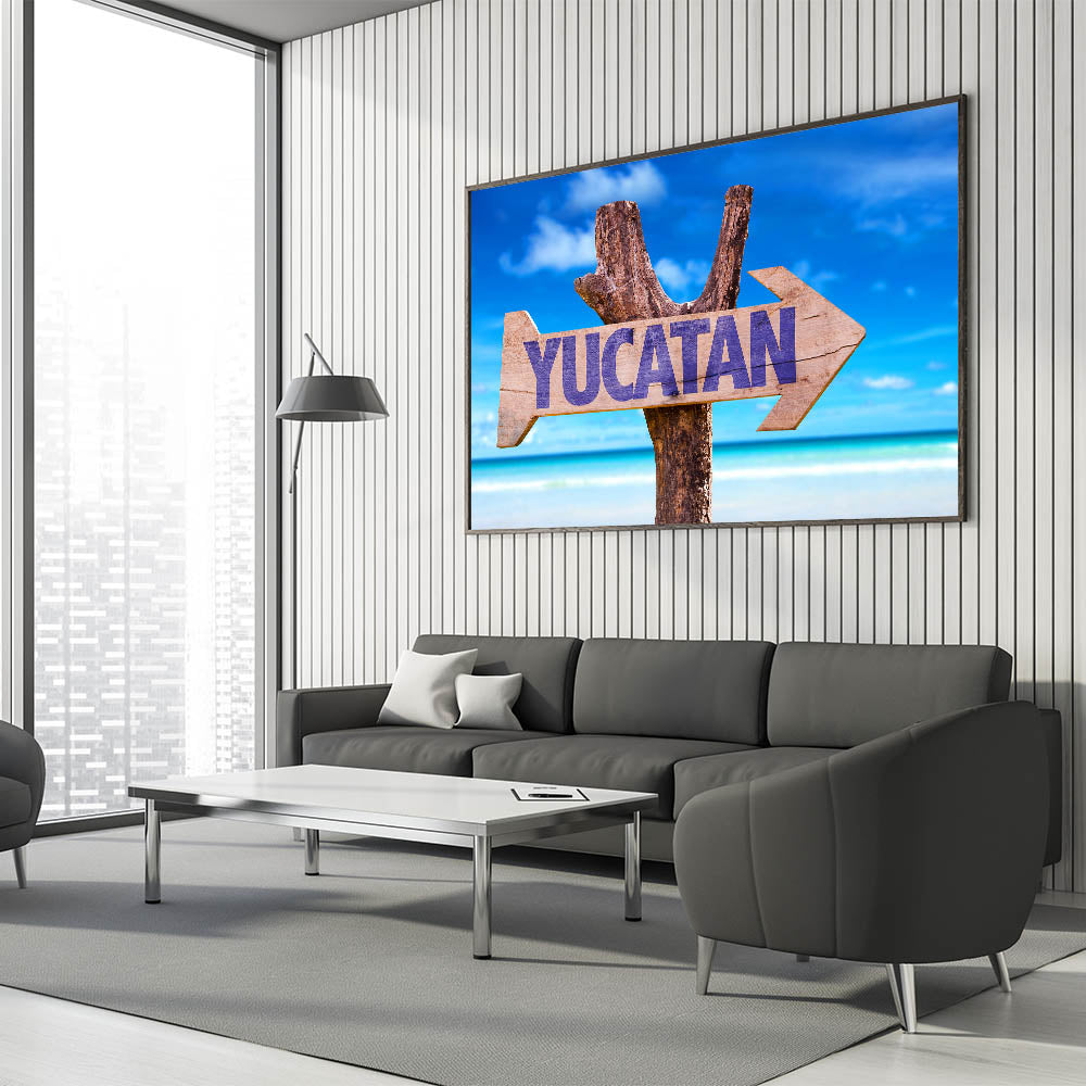 Bring the essence of the Yucatan Peninsula into your home with this vibrant Tropical Yucatan scene. Featuring a rustic sign with "Yucatan" against the backdrop of the stunning tropical beaches and clear blue skies, this Mexico Yucatan print adds a splash of vibrant coastal beauty to any space. Ideal for those who love to travel or want to bring the tropical paradise of Yucatan into their living space, this Yucatan Peninsula decor piece encapsulates the natural charm of this Mexican region.
