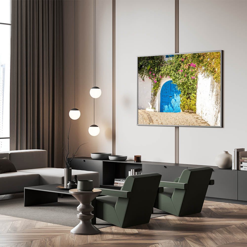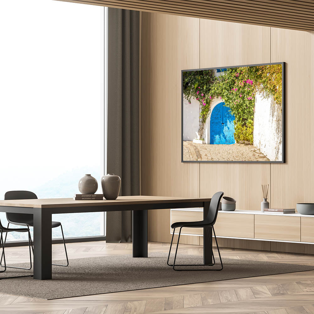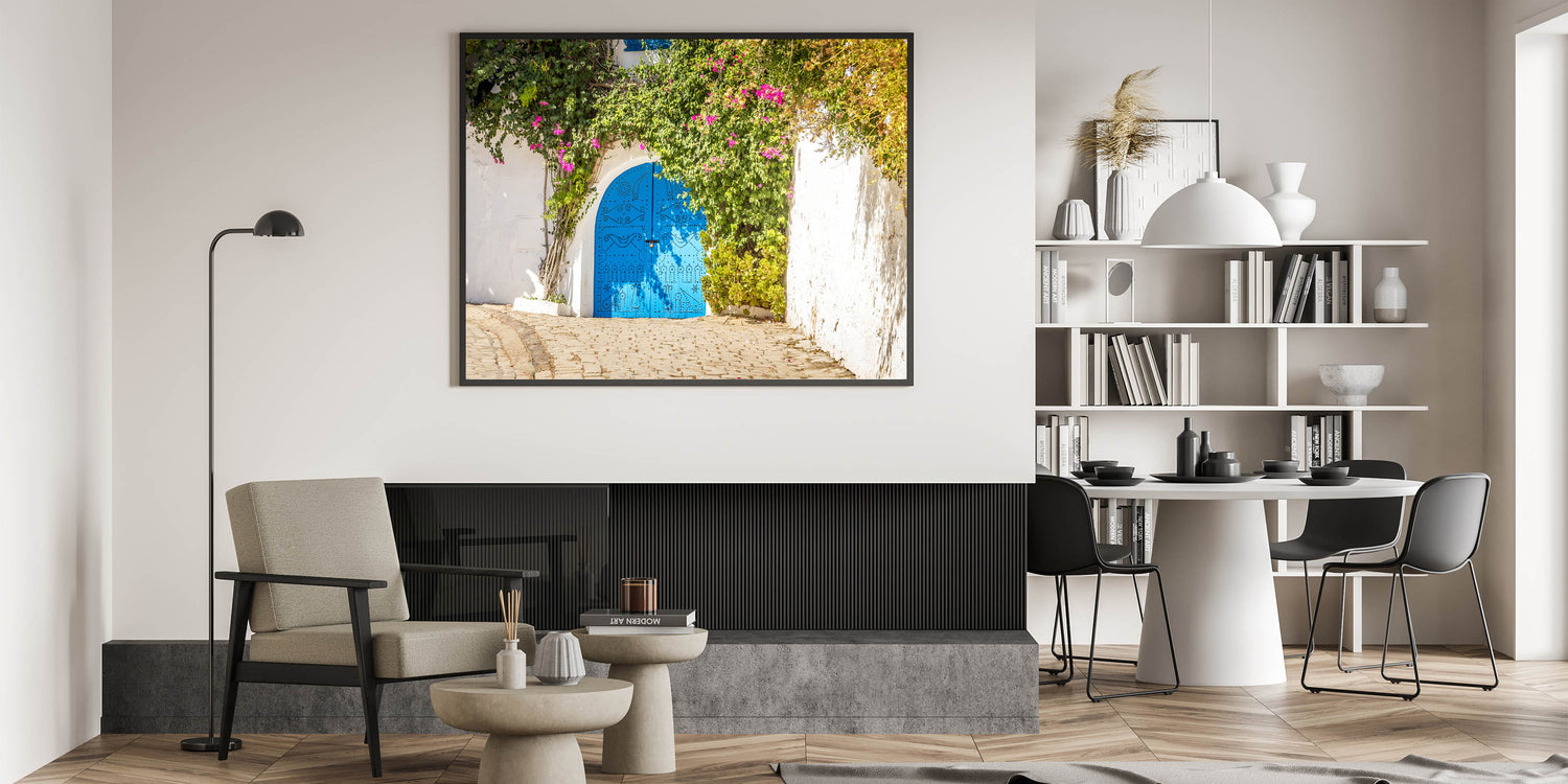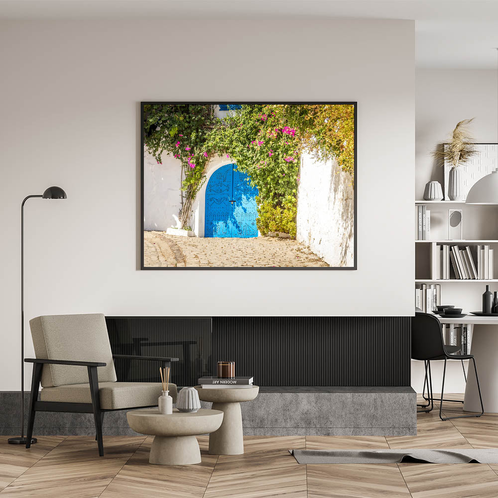 Bring the charm of traditional Tunisian architecture into your home with this captivating image of a vibrant blue door framed by cascading bougainvillea. This Tunisia-inspired wall decor captures the essence of North African art and architecture, with intricate door designs and the lush beauty of natural greenery. This piece is perfect for adding a touch of Mediterranean elegance and cultural charm to any room.