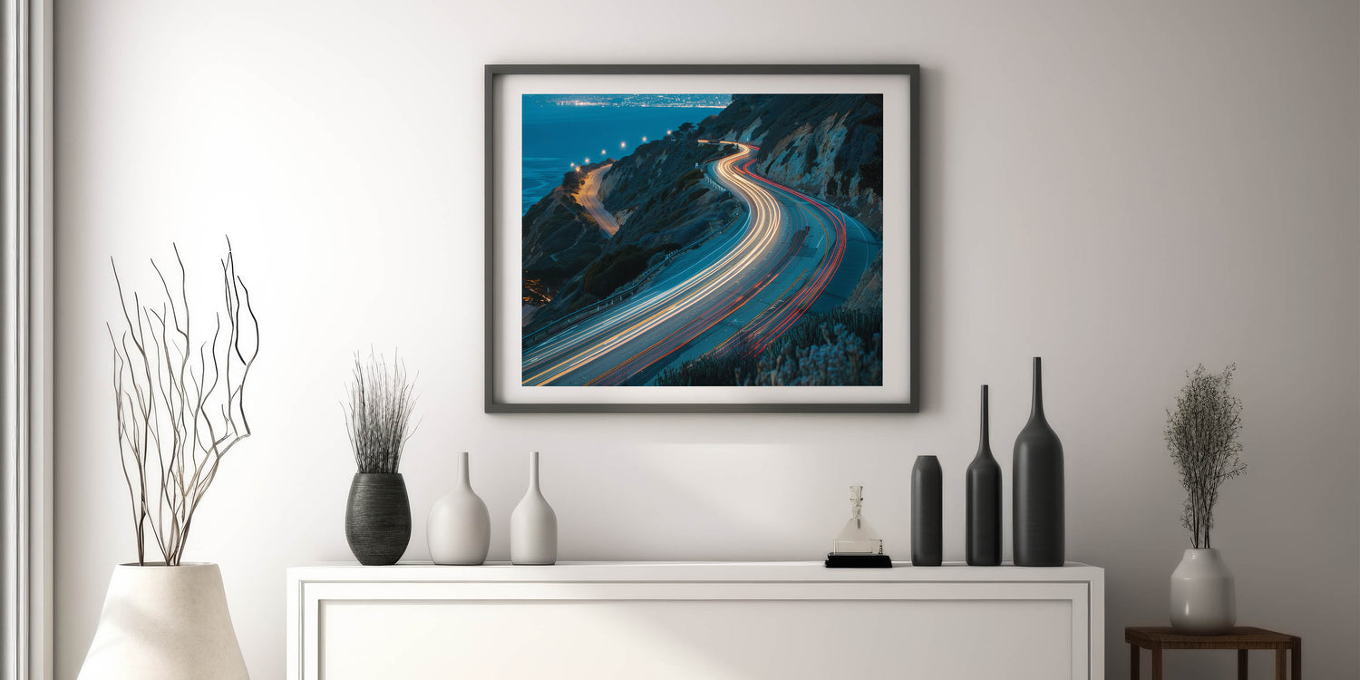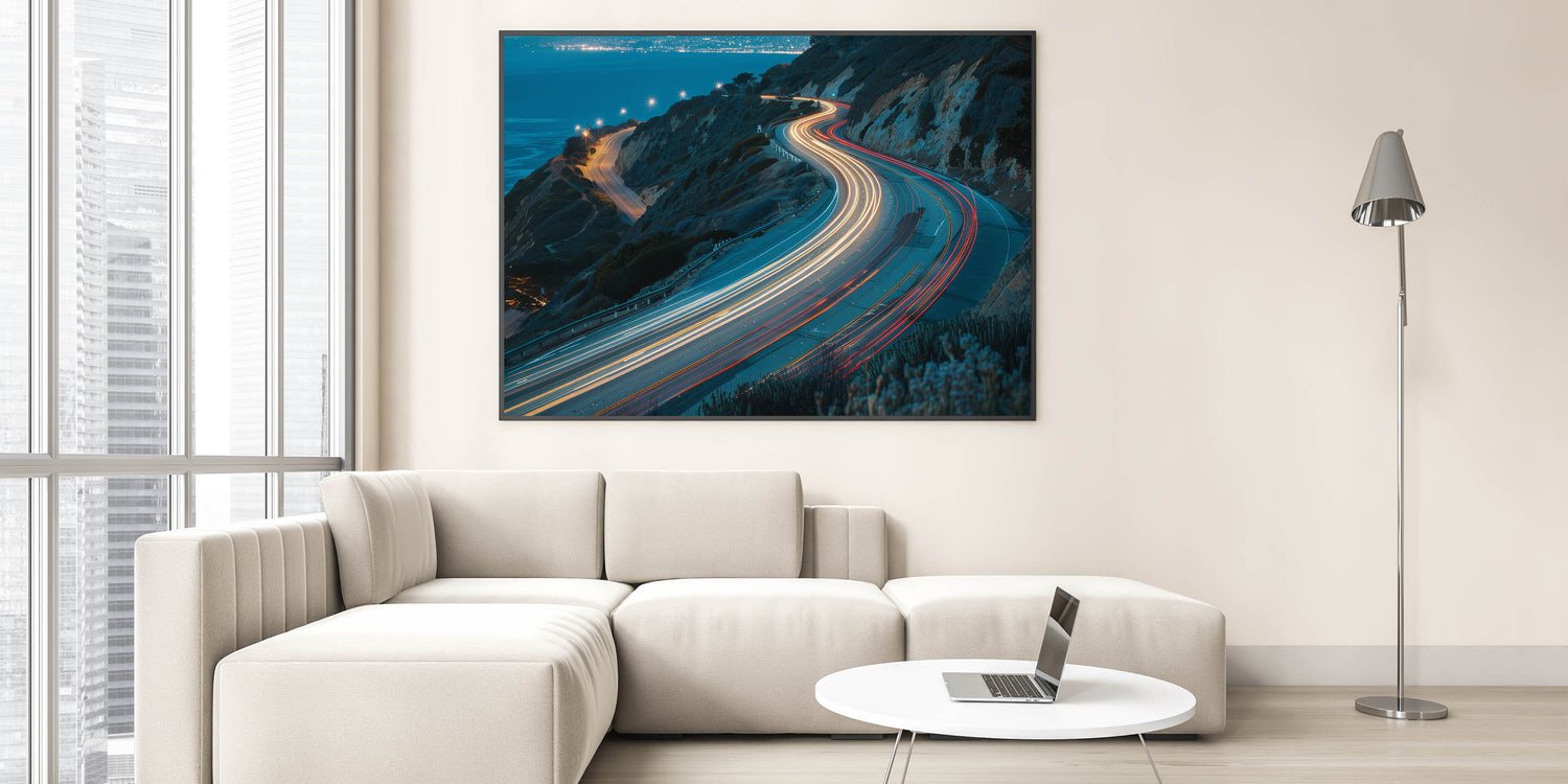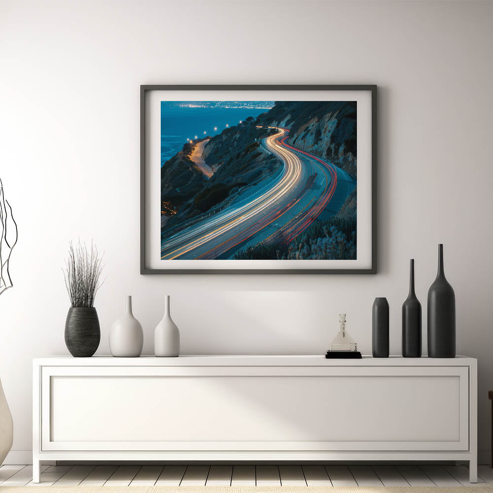 Capture the allure of a twilight drive along the coast with our "Twilight Coastal Highway Art." This stunning piece of landscape photography showcases a curving highway illuminated by streaks of light from passing cars, set against the backdrop of a serene ocean and distant city lights. Ideal for those who appreciate the beauty of urban and natural landscapes merging together, this artwork brings the dynamic energy of a nighttime coastal drive into your home.