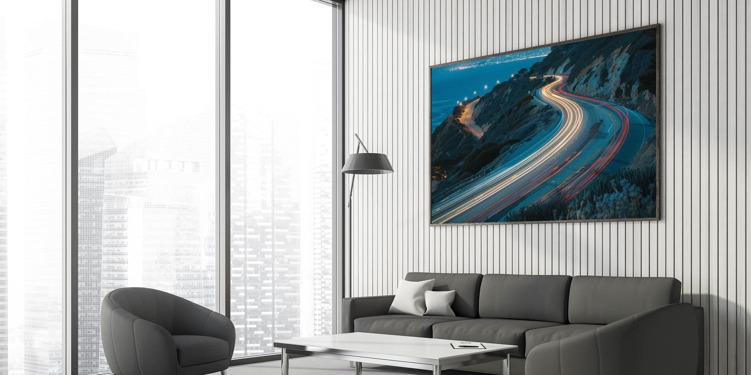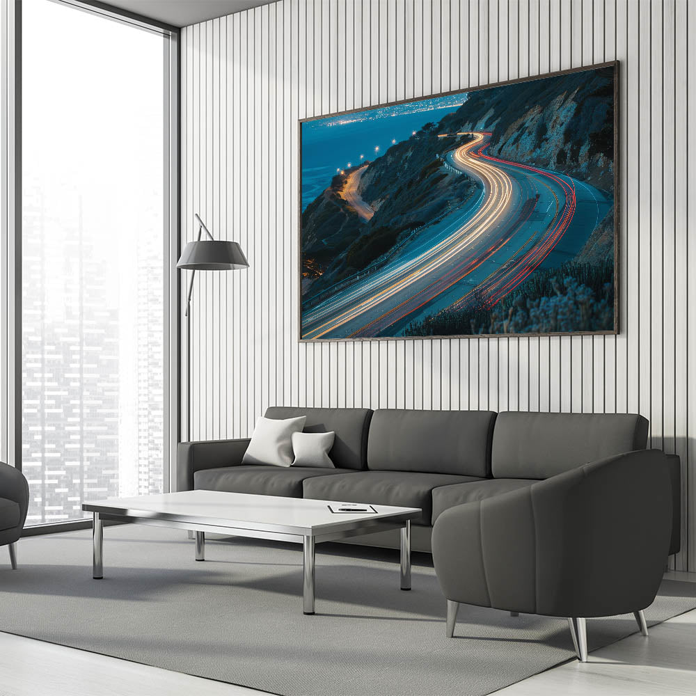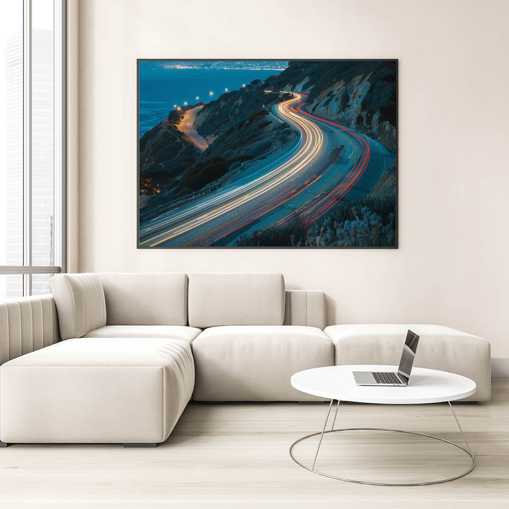 Whether you're drawn to the vibrant energy of city lights or the peaceful allure of the ocean, this piece will add a modern, sophisticated touch to any space. Order today and let the beauty of a twilight coastal highway enhance your decor.