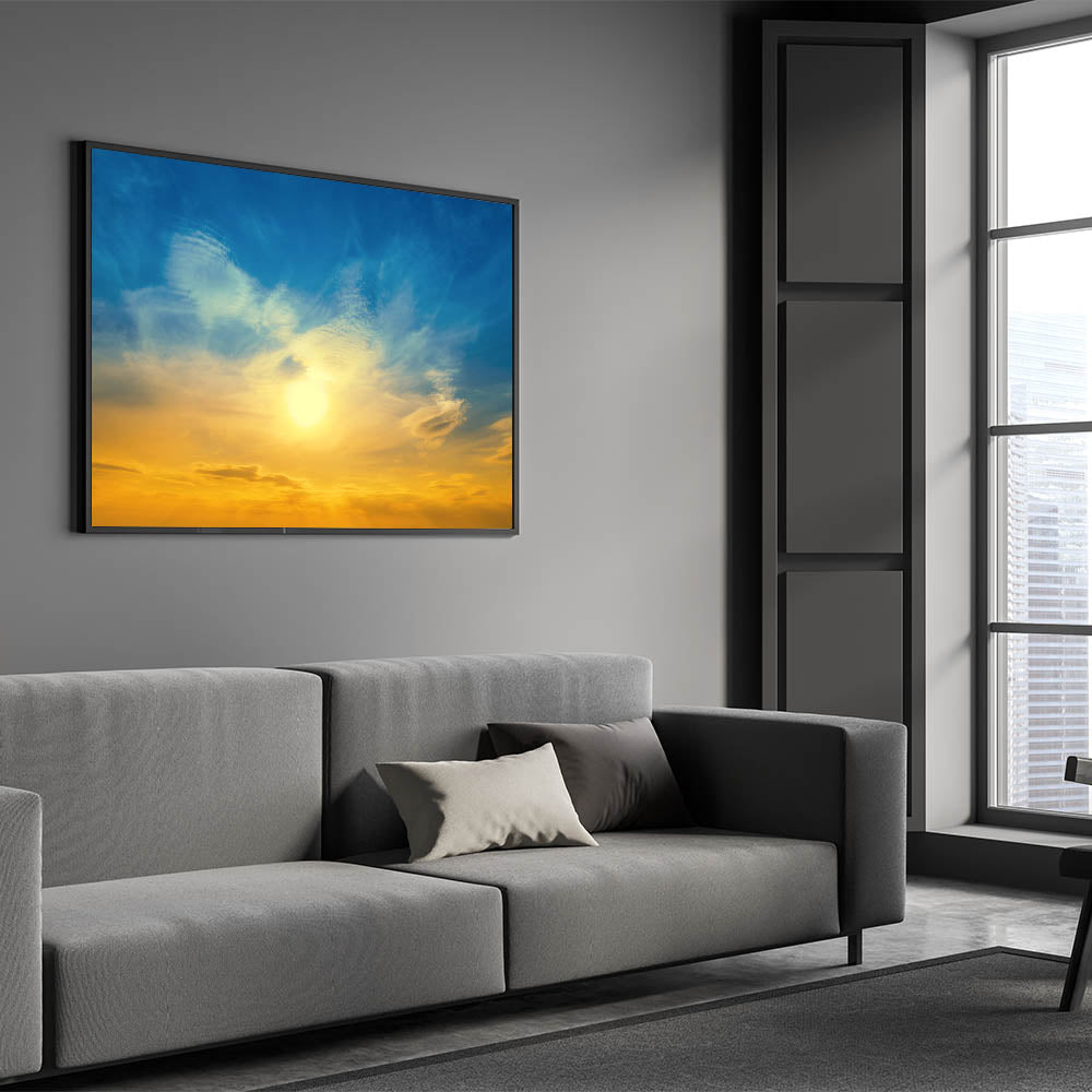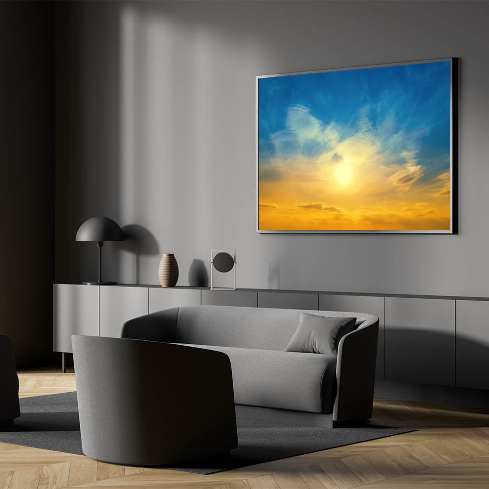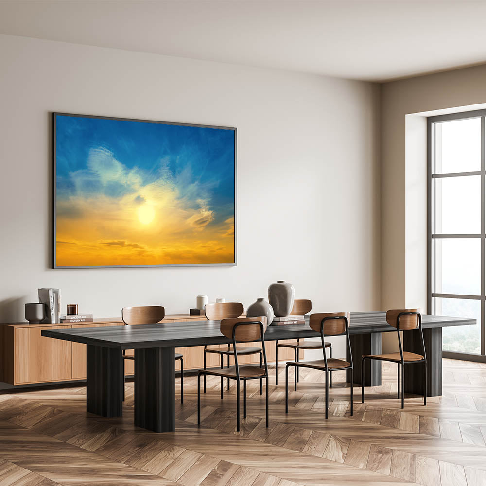 - Striking combination of golden sunset and rich blue sky, perfect for enhancing any room's ambiance.