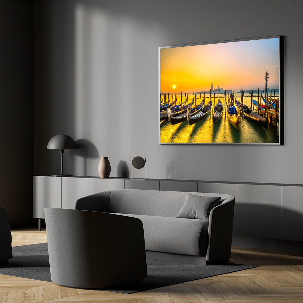 Add a touch of warmth and elegance to your space with this Venice canvas print, featuring gondolas resting on the calm waters of the lagoon at sunrise. The golden hues of the morning light reflecting off the water create a breathtaking scene that showcases the serene beauty of Venice.