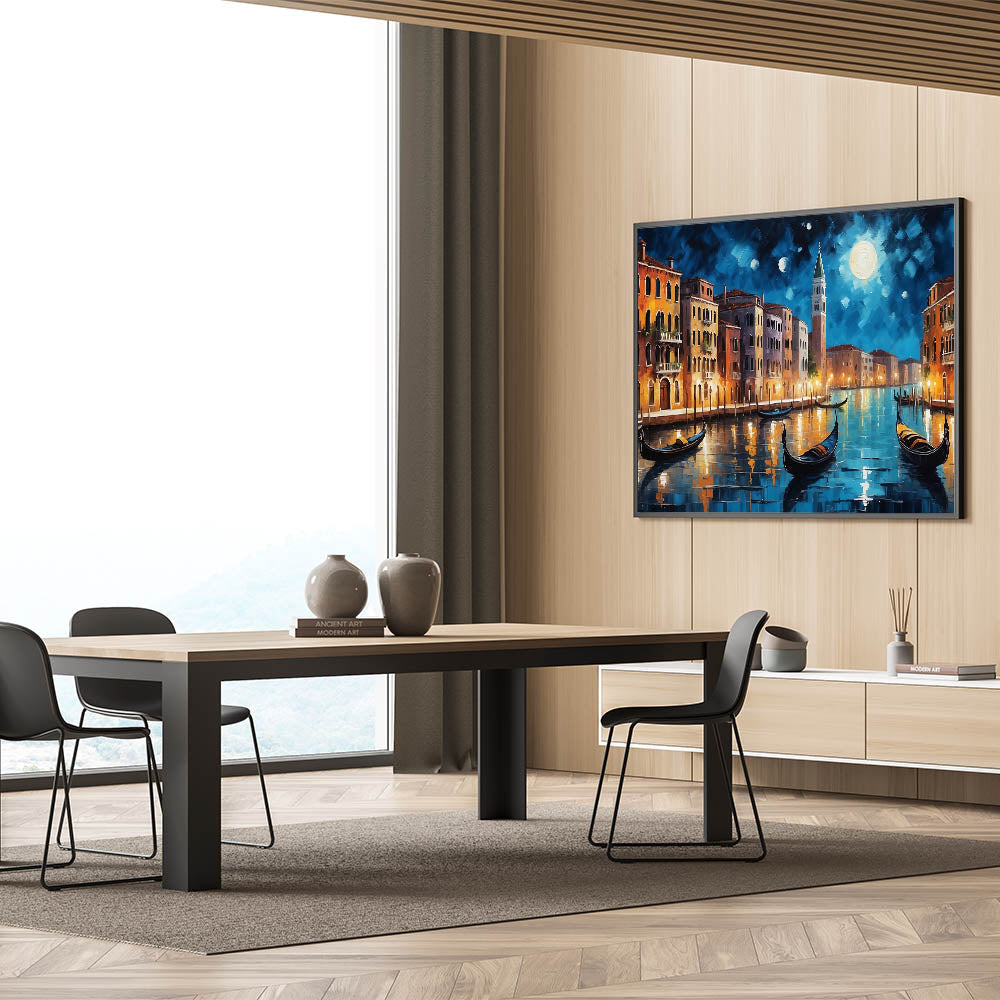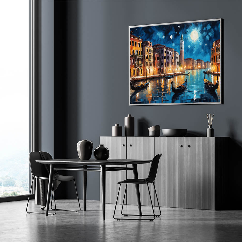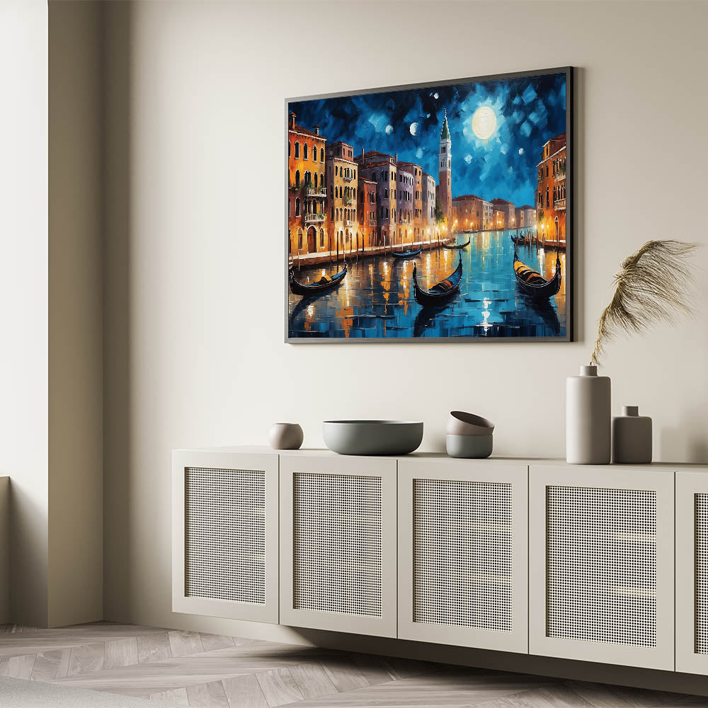 Elevate your space with this breathtaking Venice Canvas Print, featuring a stunning night scene along Venice’s iconic canals. The vibrant reflections of city lights on the water create a warm glow, while gondolas drift peacefully beneath the moonlit sky. This piece of Venice Artwork brings life, color, and a touch of romance to any room, perfectly capturing the essence of Venice Cityscape.