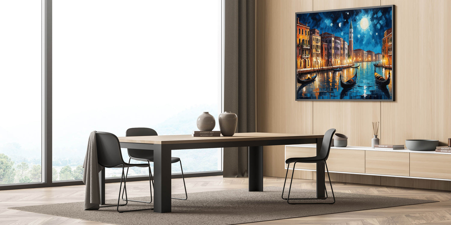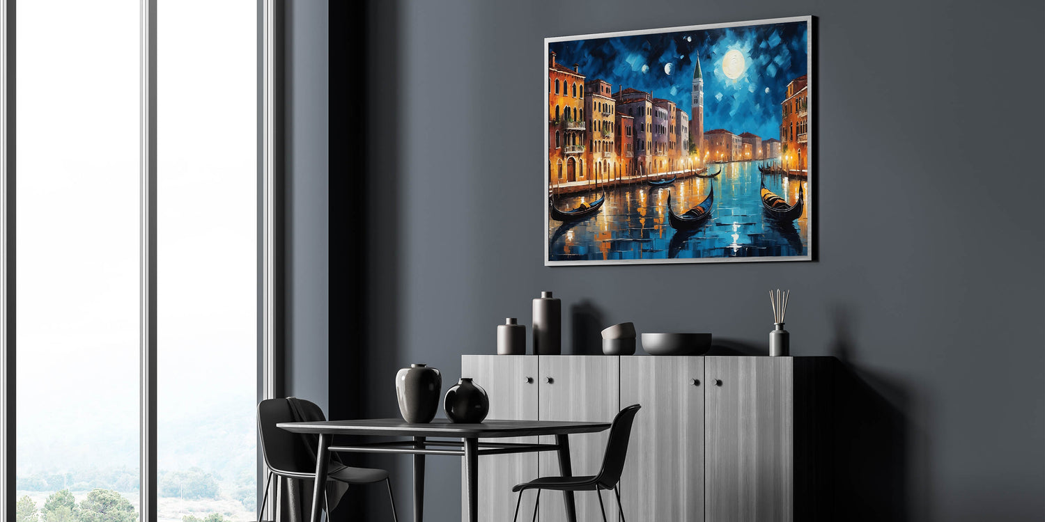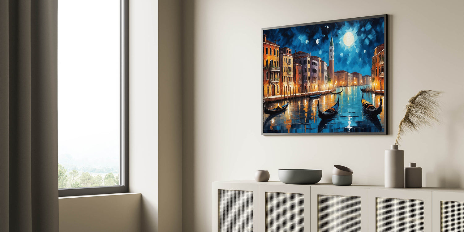 Elevate your space with this breathtaking Venice Canvas Print, featuring a stunning night scene along Venice’s iconic canals. The vibrant reflections of city lights on the water create a warm glow, while gondolas drift peacefully beneath the moonlit sky. This piece of Venice Artwork brings life, color, and a touch of romance to any room, perfectly capturing the essence of Venice Cityscape.