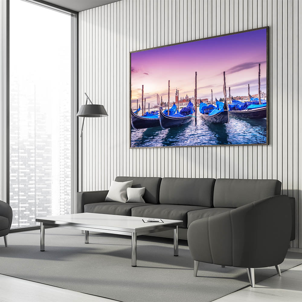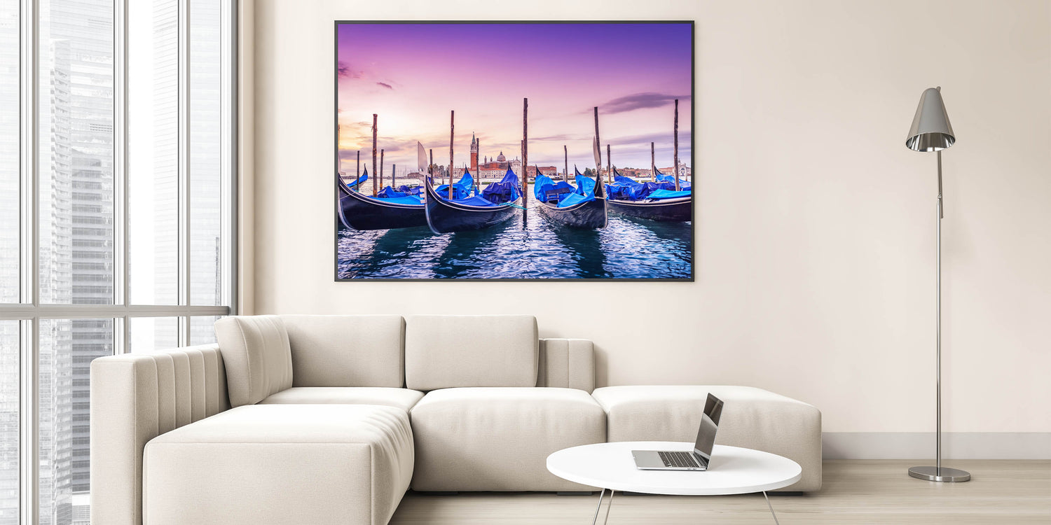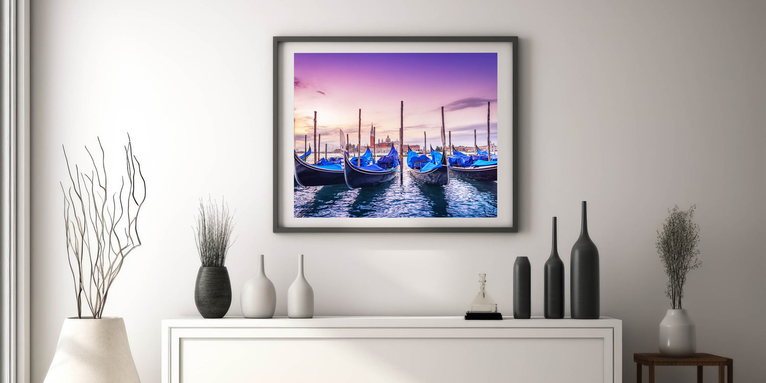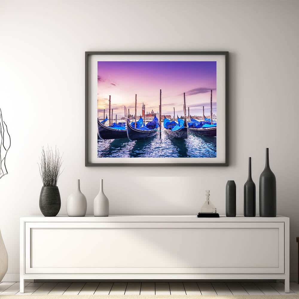 This Venice gondola artwork is perfect for those who appreciate the quiet beauty of dusk and the timeless charm of Venice. The soft colors and peaceful scene make it a versatile piece that enhances any room.