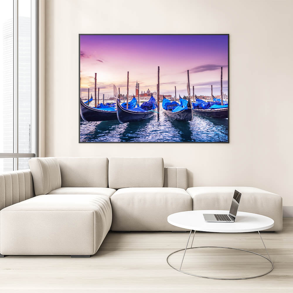 Infuse your space with the serene beauty of Venice at dusk with this stunning gondola wall art. The image captures a line of gondolas resting peacefully on the water as the sky transitions from soft pastels to deep purples. The vivid blue covers on the gondolas contrast beautifully with the gentle hues of the evening sky, creating a tranquil and calming atmosphere. This artwork is a perfect choice for anyone looking to add a touch of serenity and elegance to their decor.