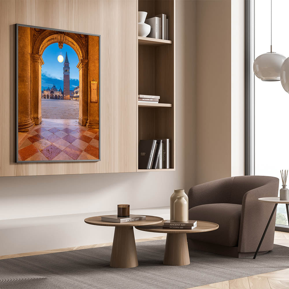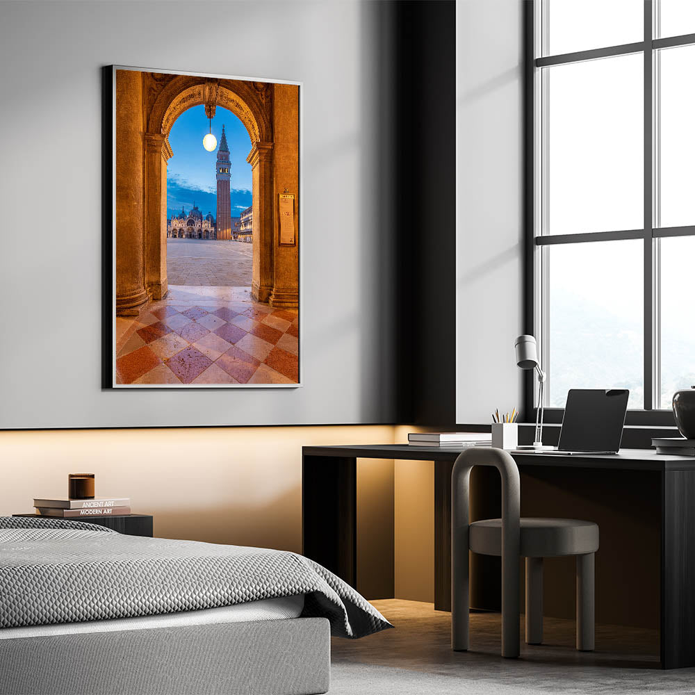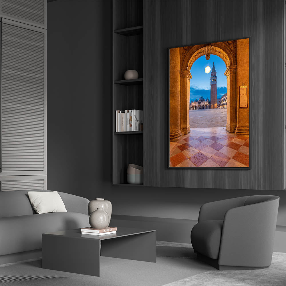 Step into the heart of Venice with this stunning Venice Painting, capturing the breathtaking view of Piazza San Marco through a grand arched entrance. The rich architectural details of St. Mark's Basilica and the iconic Campanile tower are beautifully framed, offering a timeless glimpse into Venice’s historic charm. This piece of Venice Artwork will add a sense of grandeur and cultural depth to your space, perfect for those who appreciate the elegance of Venetian architecture.