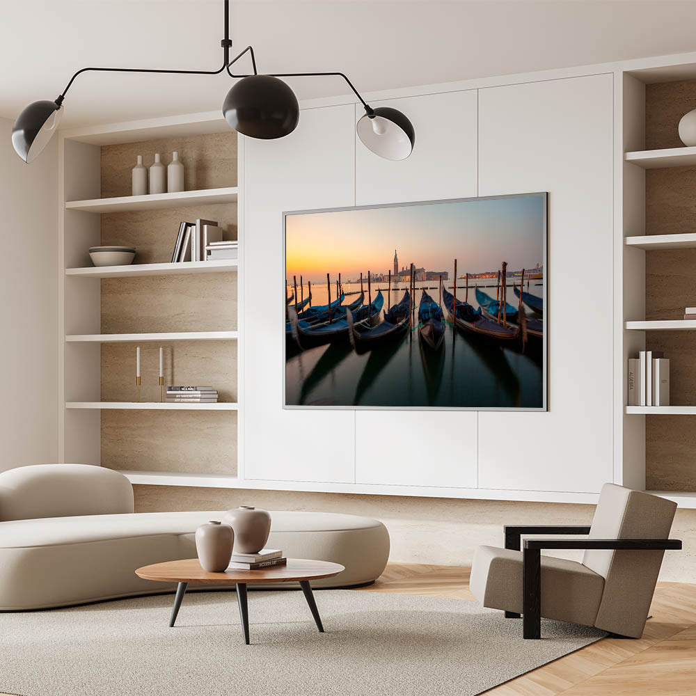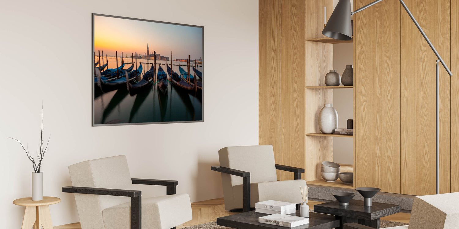 Awaken your space with the serene beauty of a Venetian sunrise through this stunning gondola wall art. The image captures a row of gondolas gently rocking on the calm waters as the sun rises, bathing the scene in a soft, golden light. The tranquil atmosphere of the early morning, combined with the iconic architecture of Venice in the background, creates a peaceful and contemplative mood. This artwork is perfect for anyone looking to bring a sense of calm and beauty into their home.