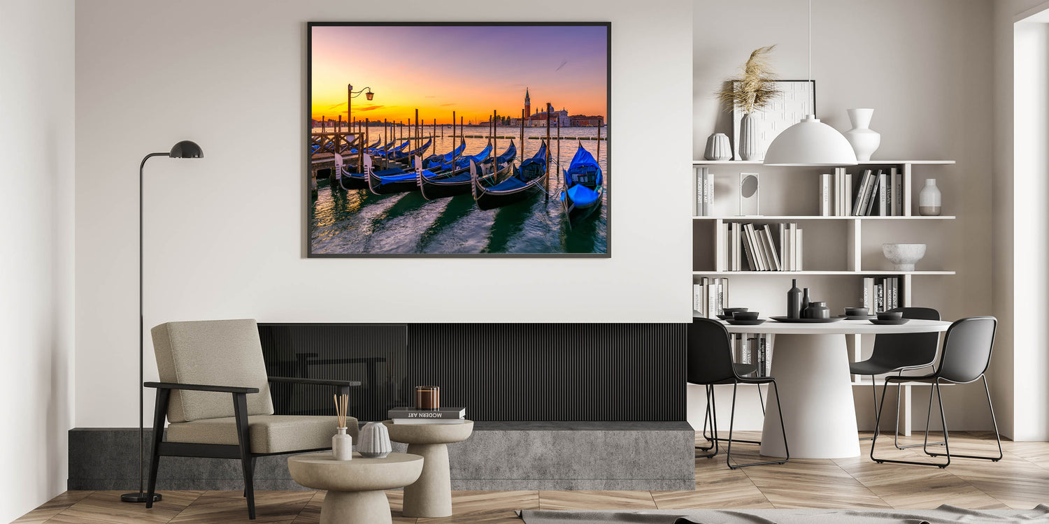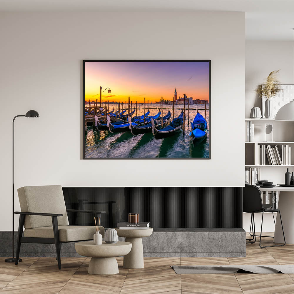 Bring the calming beauty of a Venetian sunset into your home with this stunning gondola wall art. The image captures a row of gondolas gently swaying in the water as the sun sets, casting a golden glow across the sky and water. The vibrant orange and yellow hues of the sunset contrast beautifully with the deep blue gondolas, creating a scene that is both peaceful and full of life. This artwork is perfect for anyone who loves the serene and romantic ambiance of Venice.