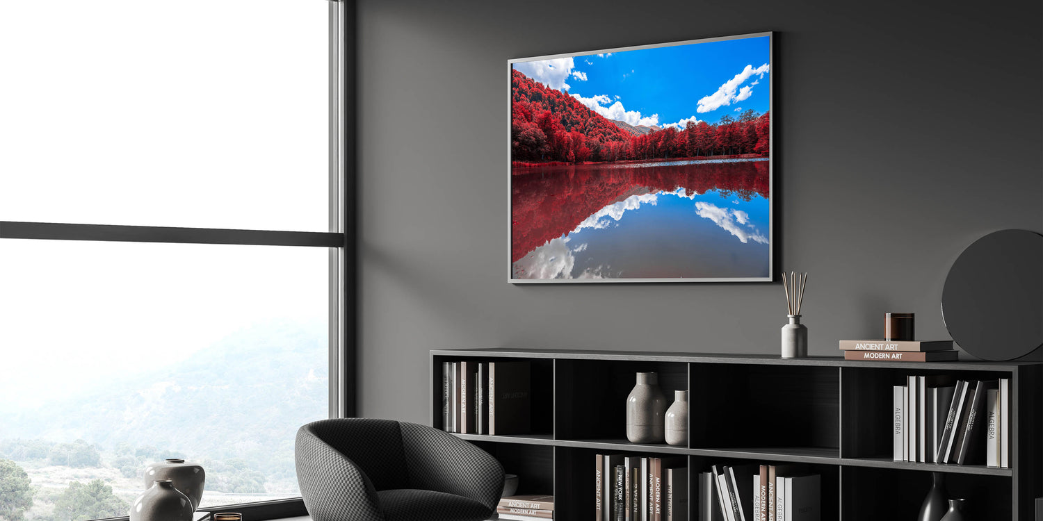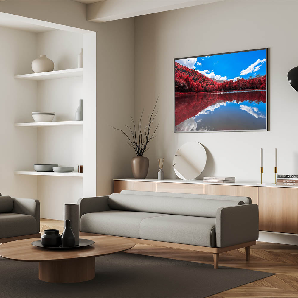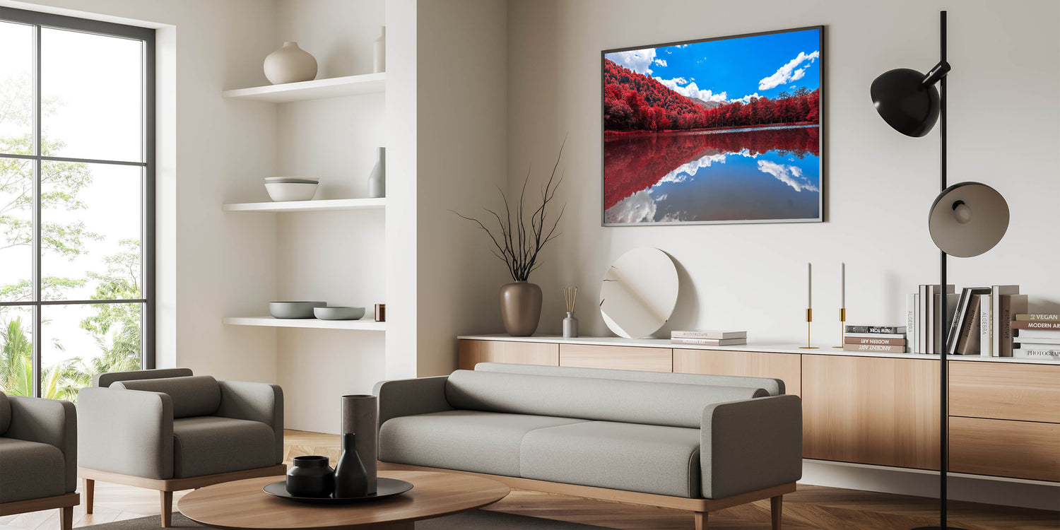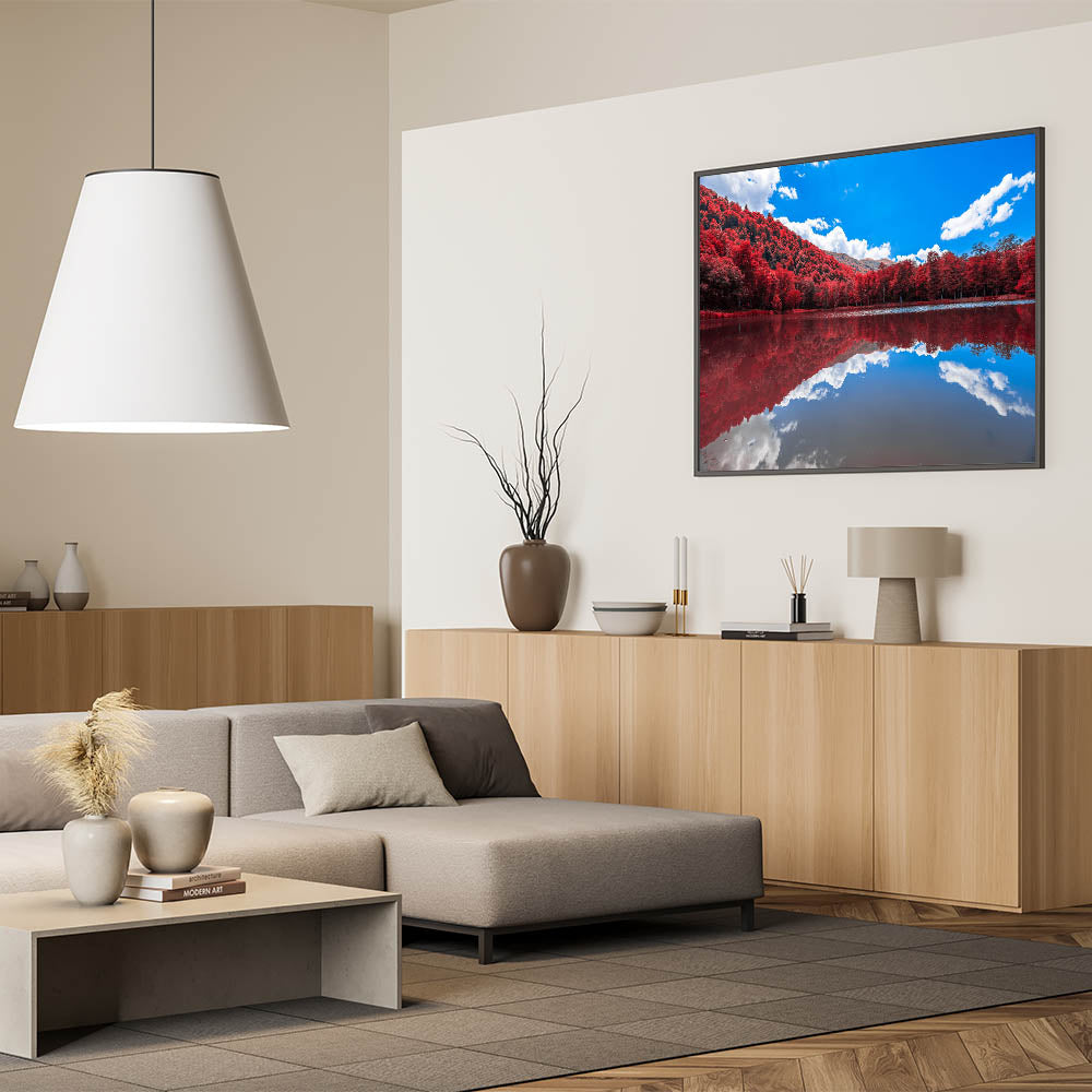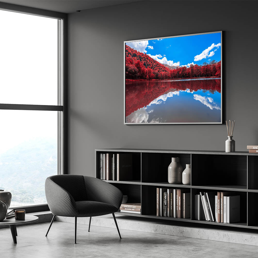 Bring the striking colors of Vermont’s autumn season into your home with this stunning wall art, featuring vibrant red foliage reflected in a calm lake. The bold red trees contrast beautifully with the crisp blue sky and its reflection in the water, creating a dynamic and eye-catching scene. This Vermont nature art captures the essence of fall in New England and is perfect for anyone who loves the rich, vibrant colors of autumn.