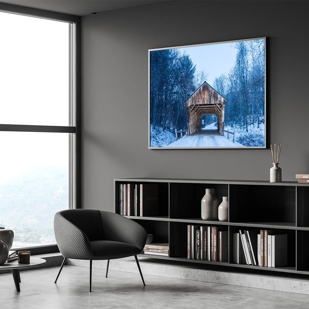 Capture the rustic charm of Vermont with this striking wall art of a classic wooden covered bridge nestled in a snow-covered forest. This serene winter scene brings out the peaceful and timeless beauty of Vermont’s landscapes, perfect for those who love the simple elegance of nature in the colder months. The aged wood of the bridge contrasts beautifully with the snow and trees, creating a captivating piece of Vermont scenic art.