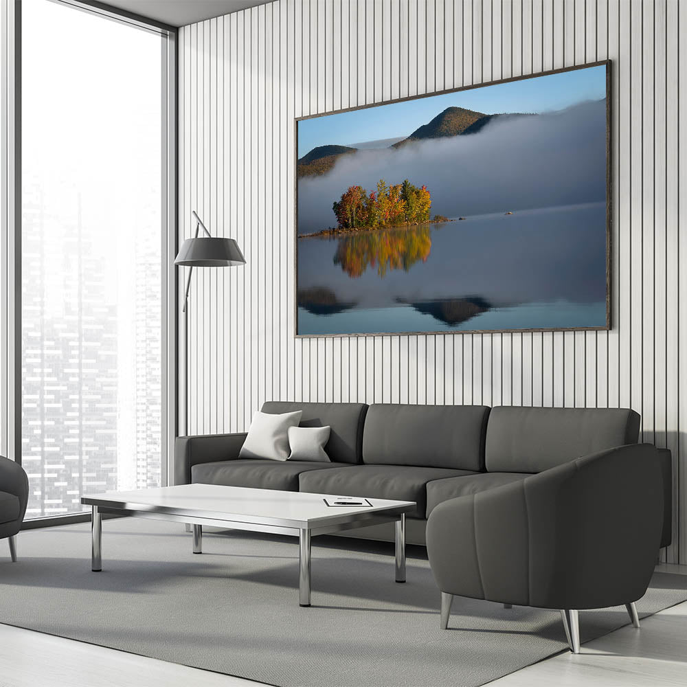 Immerse yourself in the peaceful beauty of Vermont’s natural landscapes with this stunning Vermont scenic art. This tranquil scene features a misty lake reflecting the vibrant colors of autumn foliage, set against the backdrop of distant mountains. The calm waters and soft mist create a serene atmosphere, making this piece of Vermont nature art a perfect addition to any room.
