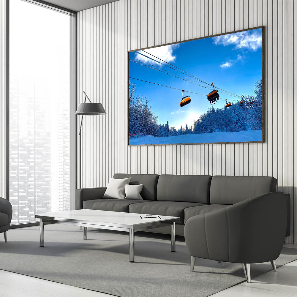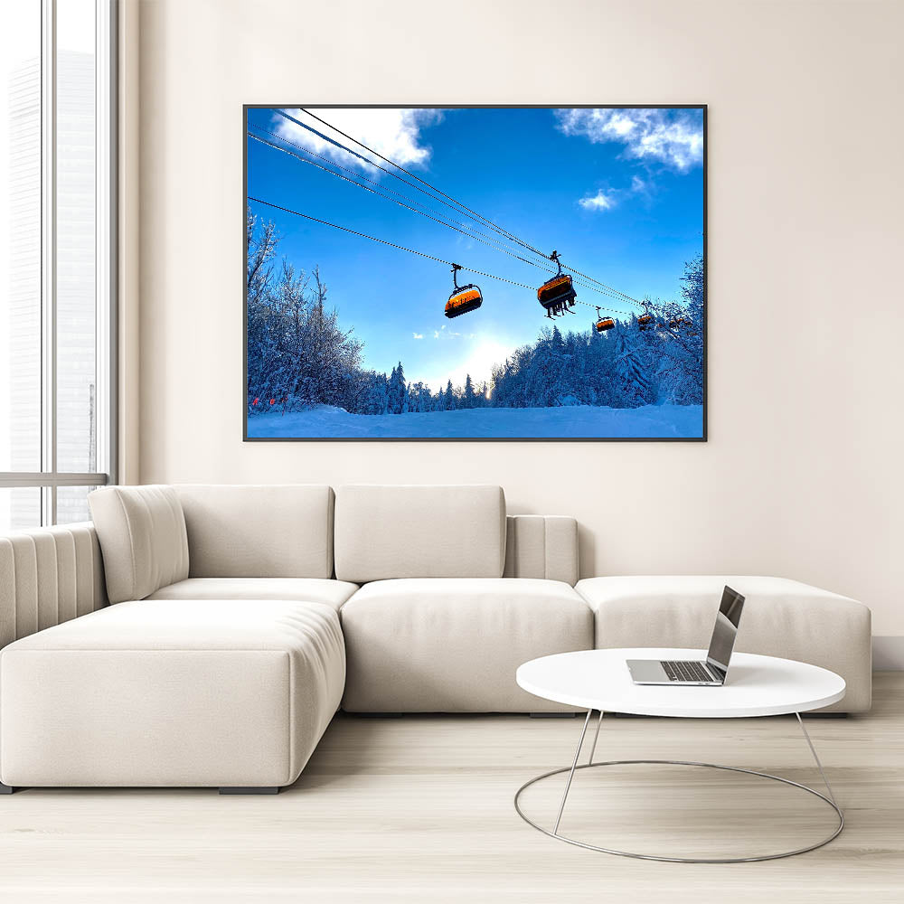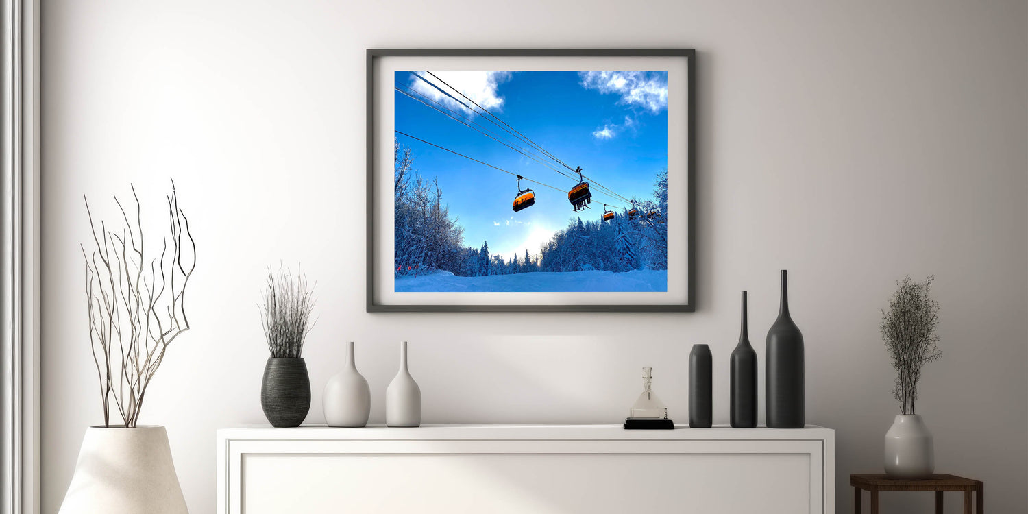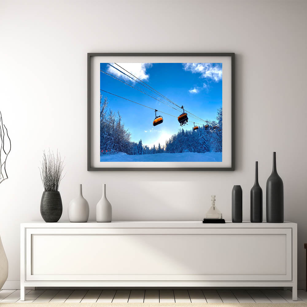 Experience the excitement of winter sports with this dynamic Vermont travel art. Featuring a vibrant ski lift ascending over a snow-covered landscape, this stunning Vermont wall art captures the thrill and beauty of a perfect winter day in the Green Mountains. The crisp blue sky and snow-covered trees make this artwork a fantastic addition to any winter or adventure-themed decor.